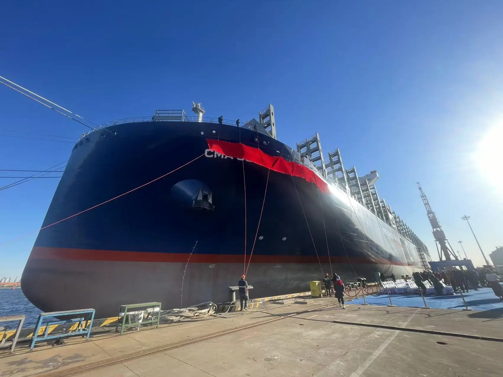 据介绍,16艘大型集装箱船中的6艘甲醇双燃料15000TEU集装箱船由中船大连造船大船天津承建。本次交付船舶为6艘船中的首制船,同时也是法国达飞海运集团旗下第400艘船舶。该船的交付,是中法友谊和深度合作的见证。