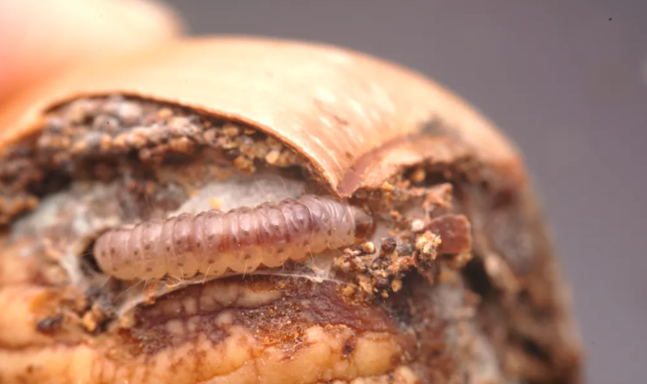 它的外壳裂了,露出的果肉上沾着虫粪一样的东西,我赶紧把它扒开,一条幼虫出现了,但很显然不是象甲,这是鳞翅目的宝宝啊!