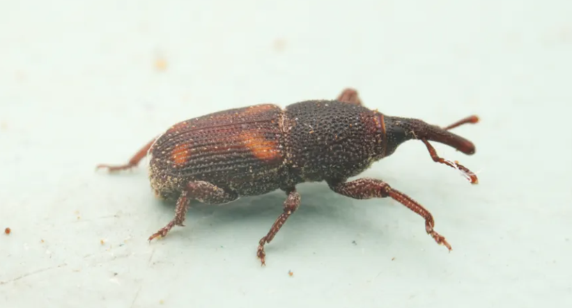 长大以后大概是下图的样子,这是二斑栗实象(Curculio bimaculatus),有着“长鼻子”的小甲虫,当然这其实不是鼻子,而是它们的口器,也叫“喙”。雄虫的喙比较短,触角从喙的中部长出来;雌虫的喙比较长,触角从喙基部大概1/3的地方长出来。同属有许多种,形态比较接近。