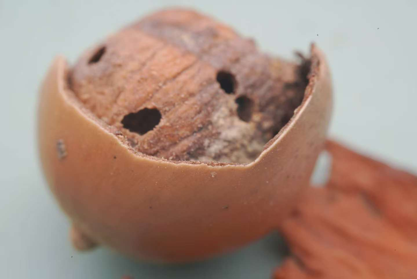乍一看,它们有好几只,混在虫粪和橡果子的碎屑中。仔细一扒拉,老天,越扒越多,最后竟数到了十八只!小小一颗橡果子竟然能养大这么一群玉米象兄弟姐妹吗?!当然,它自己已经变得千疮百孔不忍直视了……