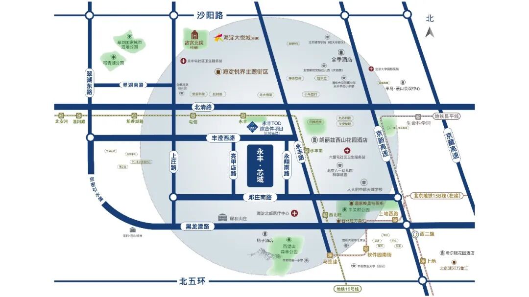 永丰·芯域坐落于海淀区“8+1”产业集聚组团中的永丰组团,占位“北清路前沿科创发展走廊”与“中关村大街高端创新集聚发展走廊”两大动脉交汇节点,是海淀最具潜力与活力的科创增长极之一。