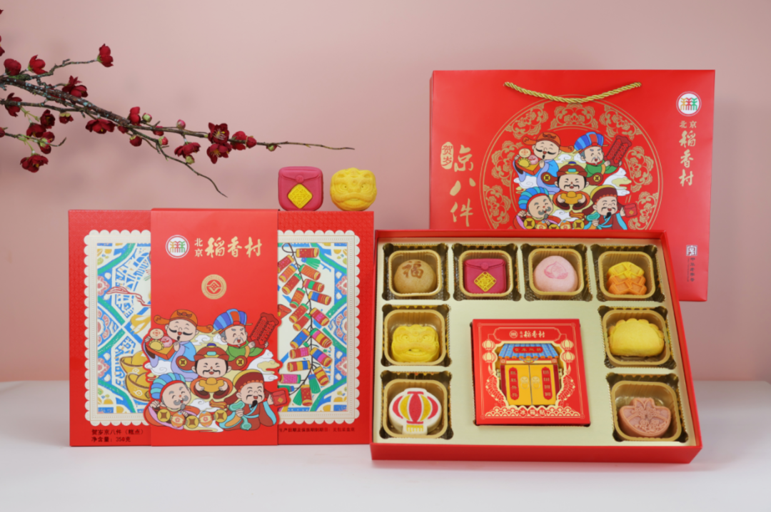 老北京人过年,怎能少了稻香村!贺岁京八件礼盒,把京式糕点制作技艺与春节习俗揉在一起,八块糕点对应八种年味祝福,醒狮、花灯纹样添彩,附赠的“食来运转”冰箱贴,让年味更添趣味。