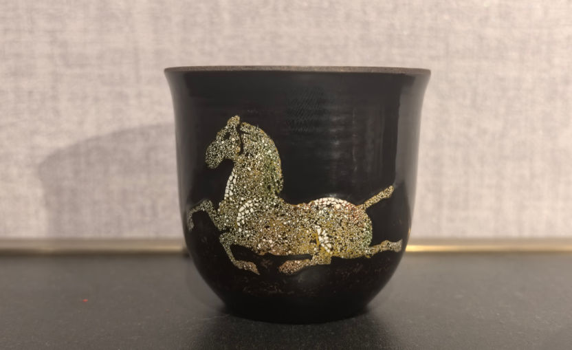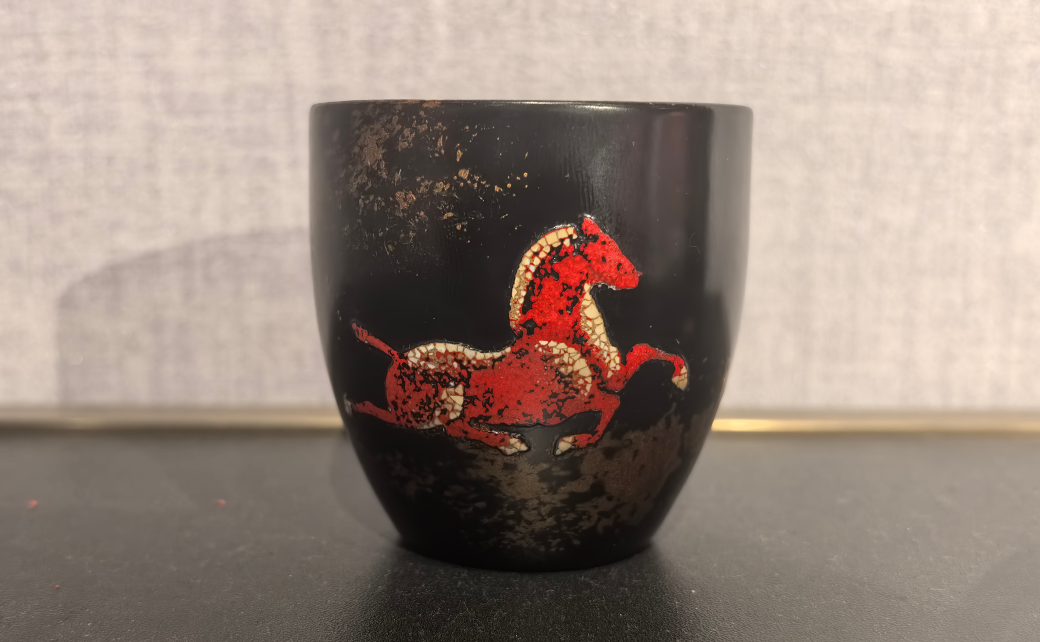 优质木材为胎,层层髹涂大漆,漆面温润莹泽,自带古朴沉静的质感。杯身奔马纹样,用蛋壳镶嵌技法打造,红白蛋壳纹理与黑漆底釉相映成趣,奔马矫健灵动,仿佛要破壁而出。捧在手中,喝茶都成了一场与非遗的对话。