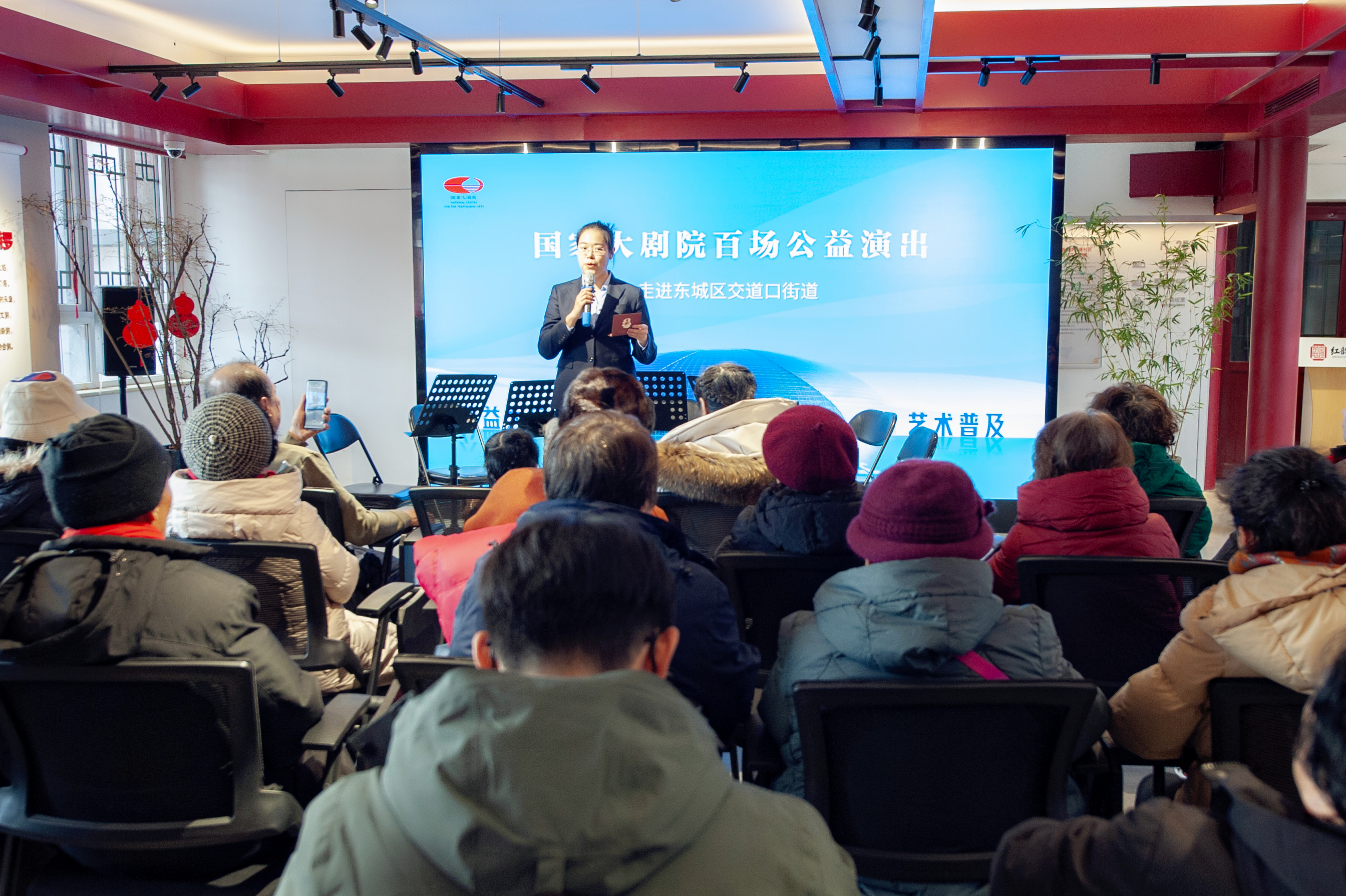 演出尚未开场,能容纳50名观众的多功能厅已座无虚席,邻里围坐分享对演出的期待,氛围热闹又温馨。“早就听闻国家大剧院演出水准高,这次不用远行在家门口就能看,特意拉着老邻居一起来!”家住附近胡同的张阿姨笑着说道。