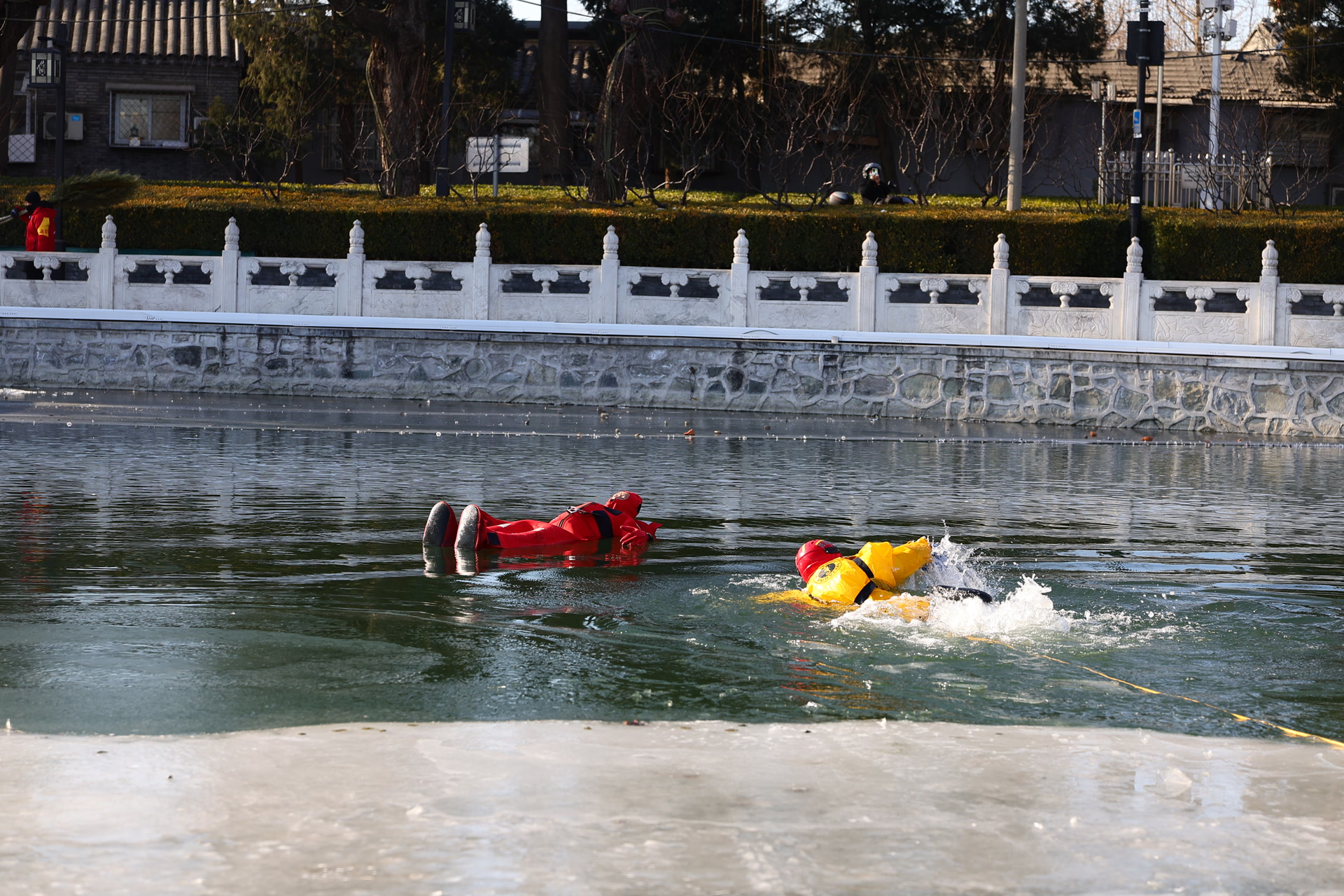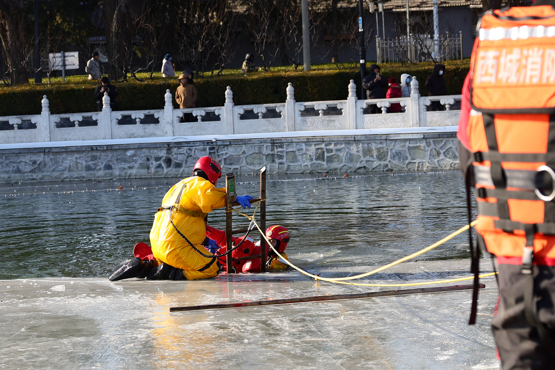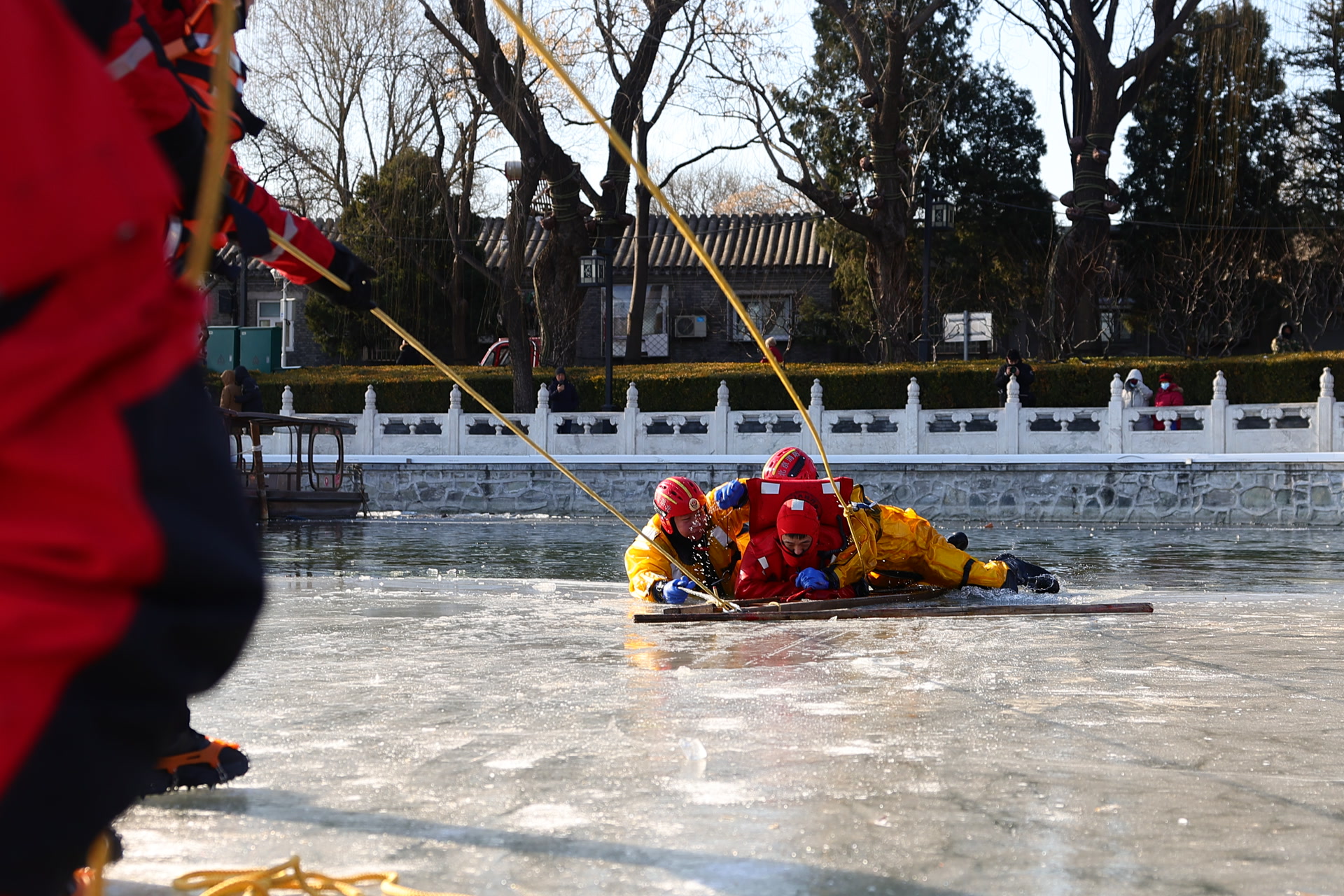“一九二九不出手,三九四九冰上走。”1月22日,是“四九”的第六天,上午,在什刹海冰场,来自北京市西城区消防救援支队的消防员冒着零下10℃的严寒,在冰与水之间,上演了一场应急救援实战演练。
