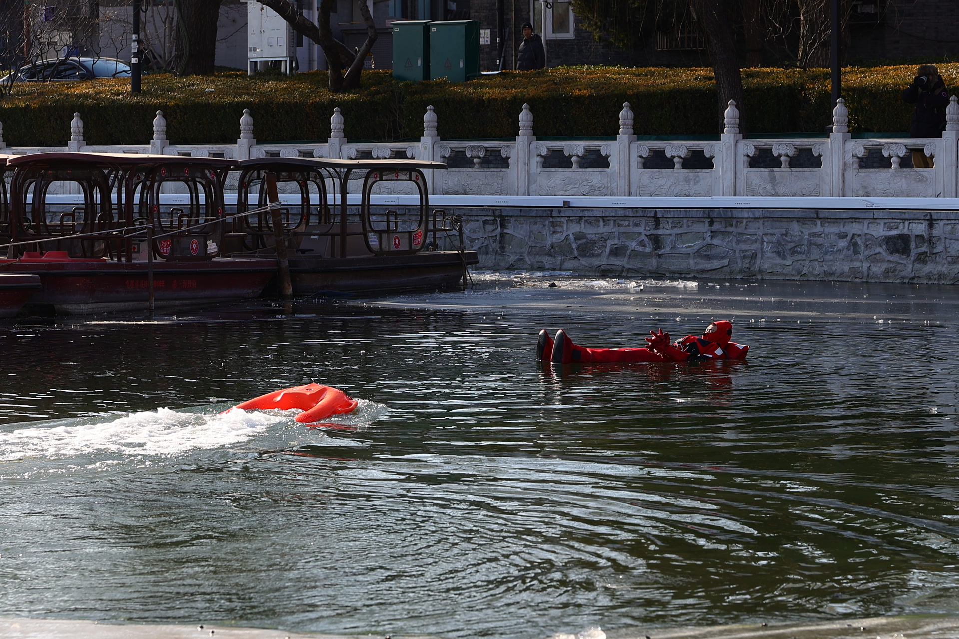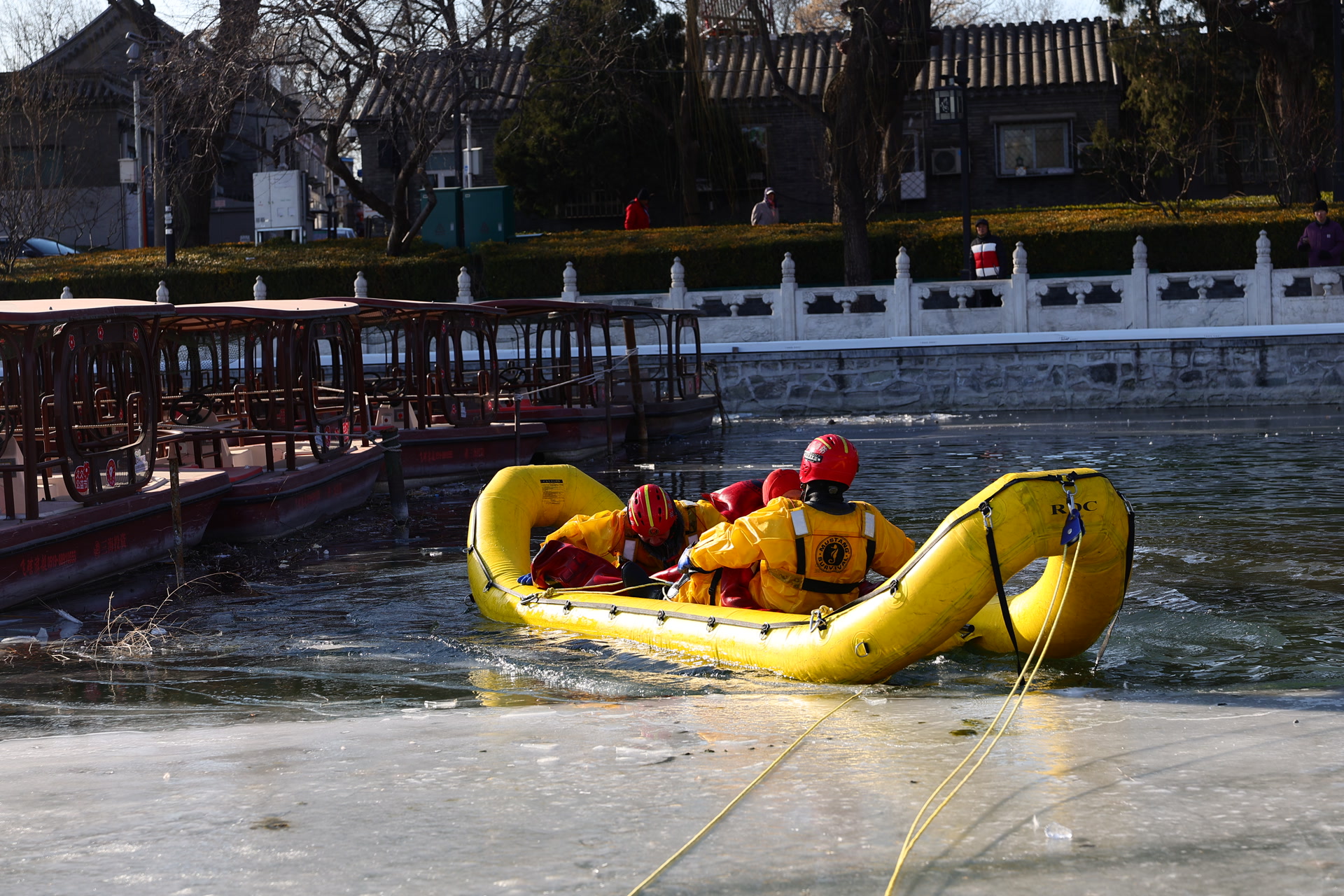 “单杠梯可以插入水中,搭在冰缘,帮助消防员带着落水者爬出;漂浮担架在水中可以提供一定浮力,协助我们承托落水者;‘香蕉船’是一种救援浮舟,除了能提供浮力外,还可以帮助我们转移落水者。”参与演练的什刹海消防救援站消防员刘正轩介绍。