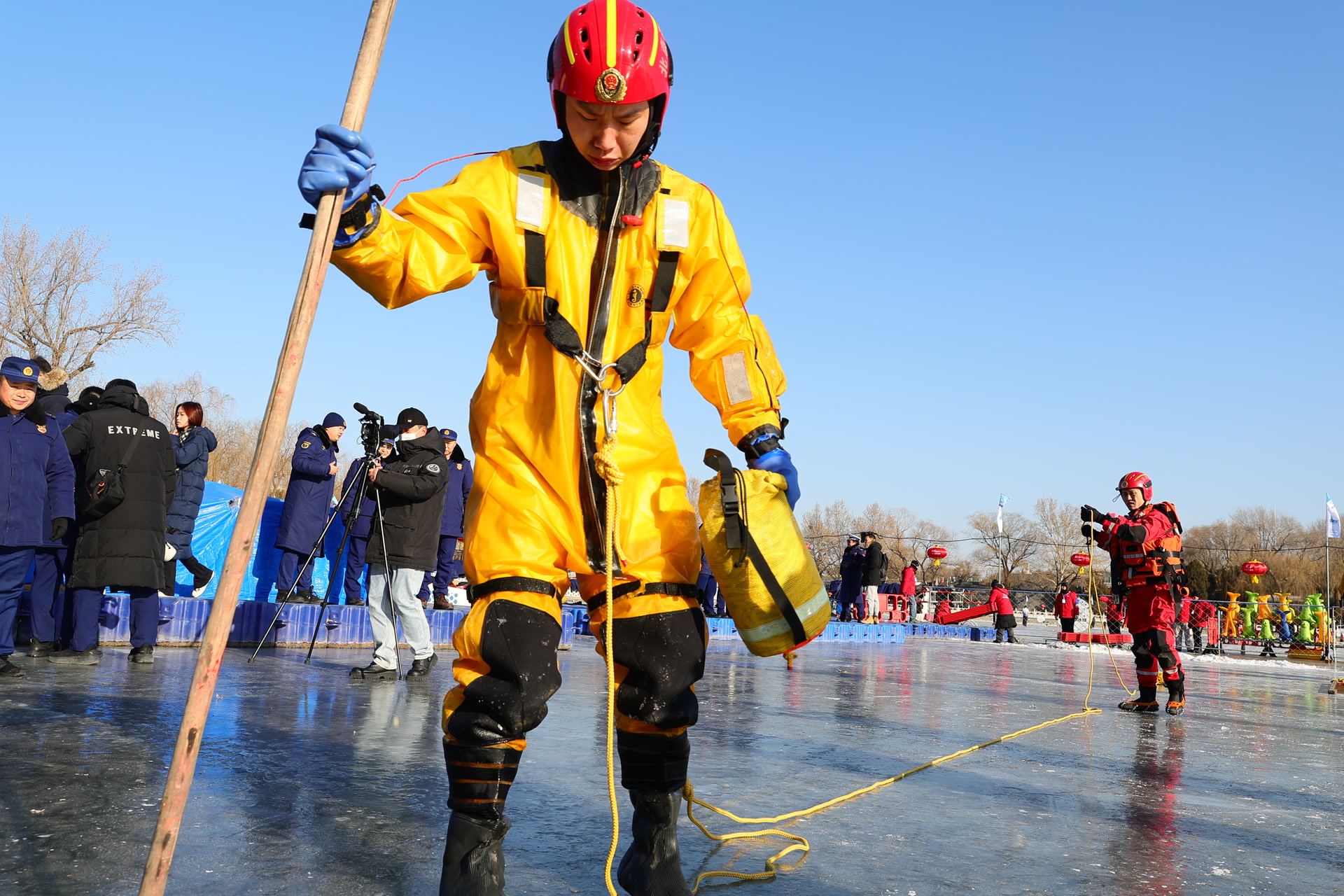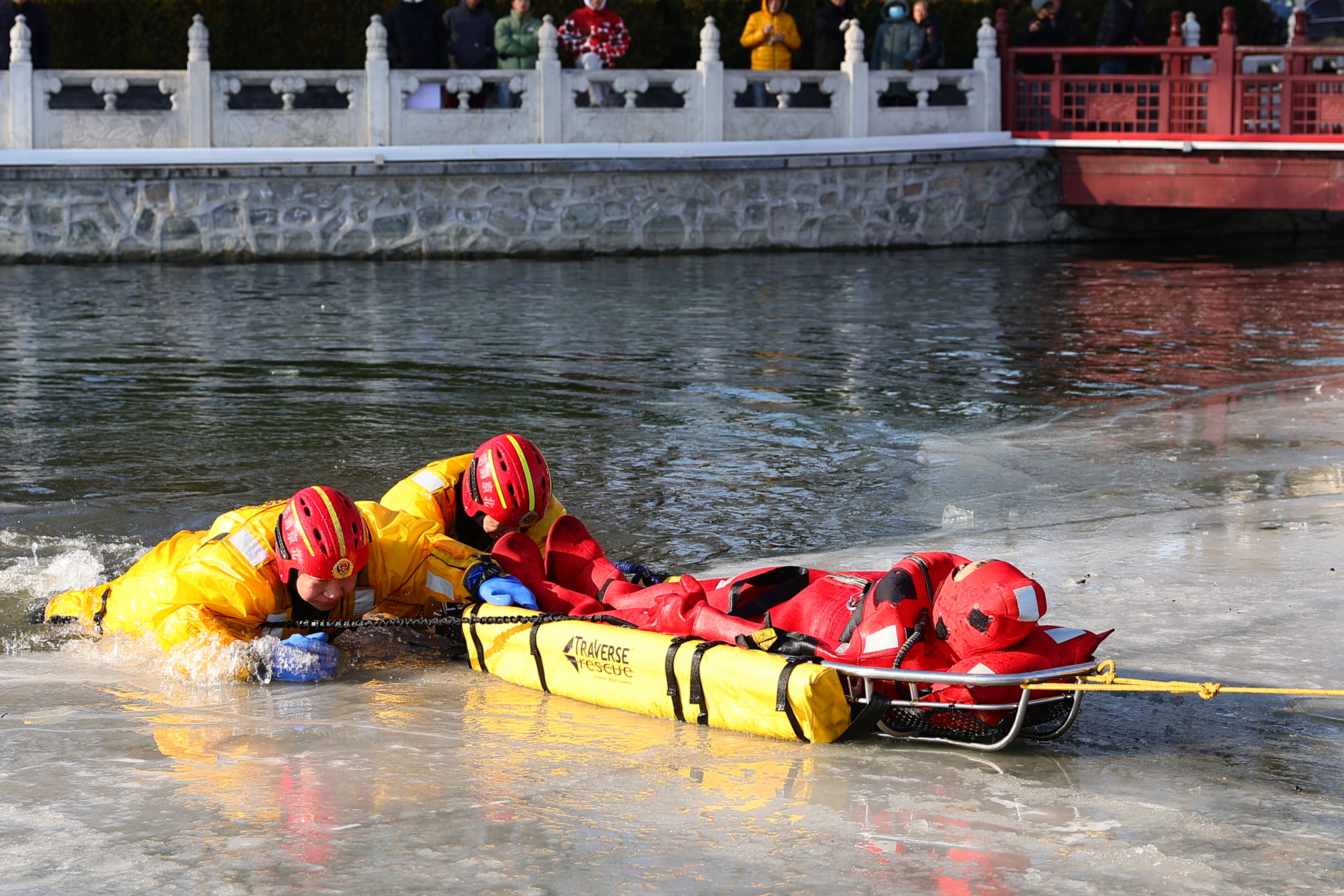 “有游客落水了!快来救人!”10时,随着一名扮演游客的消防员掉入冰水,演练正式开始。消防员们围绕“游客不慎坠冰”这一警情迅速行动。面对突发意外,队员们首先快速评估现场冰层厚度、落水者状态及周边环境,紧接着,利用冰锥制作稳固的冰面锚点、利用绳索架设保护和提拉系统。