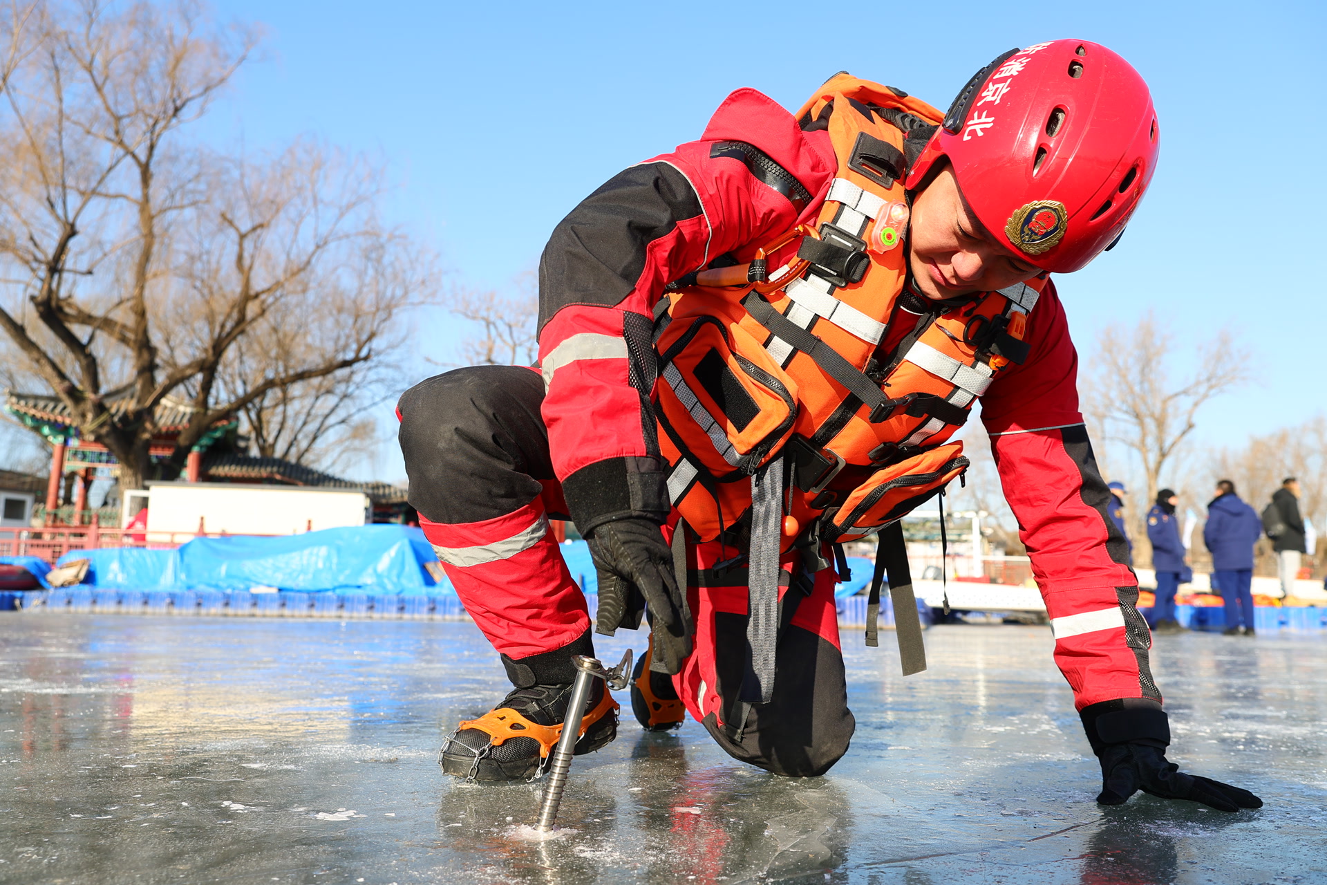 上午9时许,什刹海冰场后海区域开放不多久,已有不少游客踩上冰刀,嬉戏驰骋。在冰场护栏外的冰面上,一群消防员整装完毕,一场旨在提升冬季冰域应急救援实战能力,强化应对冰上突发事件处置水平的演练即将上演。
