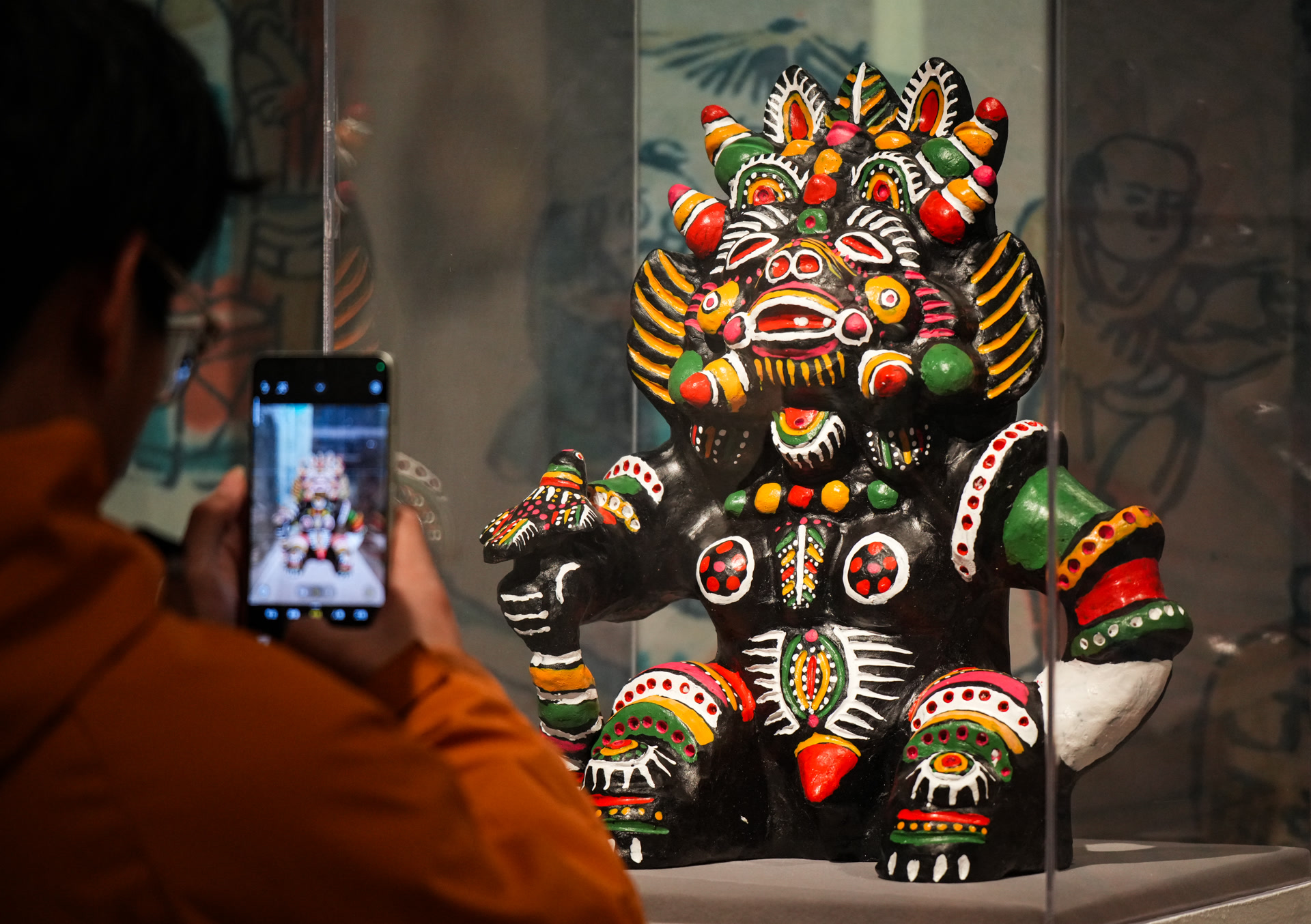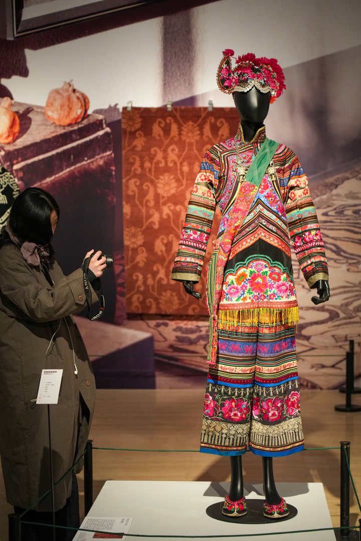 展览现场, 绣娘李如秀收藏的一件古董彝绣服饰吸引了许多观众围观。楚雄彝绣已有1700多年的传承历史,以创意巧妙、配色大胆、设计精美闻名。非遗代表性传承人张华伟创作的《辈辈侯》,在传统泥泥狗造型基础上融入了现代审美元素,通过精湛的陶泥技艺,生动表现了传统文化的延续与创新。展览由中国美术馆、中国民间文艺家协会、中国美术学院共同主办,将展出至2月1日。