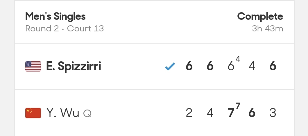 这是双方首度交锋。比赛前两盘,斯皮齐里打得更为主动,6比2、6比4快速拿下。吴易昺在第三盘盘中逐渐找到感觉,打出自己的节奏。比赛拖入“抢七局”后,吴易昺依靠“迷你破发”,7比6(4)扳回一盘。