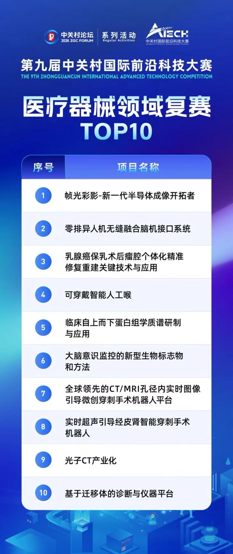 2026中关村论坛系列活动——第九届中关村国际前沿科技大赛医疗器械领域复赛近日在中关村医疗器械园举办。记者1月23日从市科委、中关村管委会获悉,帧光彩影—新一代半导体成像开拓者、零排异人机无缝融合脑机接口系统、乳腺癌保乳术后瘤腔个体化精准修复重建关键技术与应用等项目跻身前沿大赛医疗器械领域前十强。