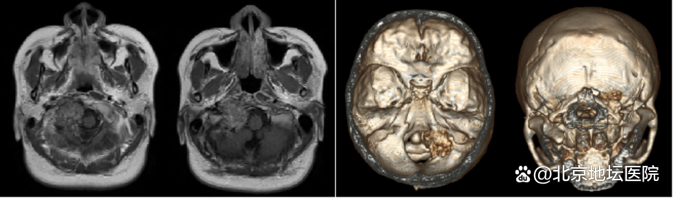 检查时,医生在小兰颈枕交界的枕髁区发现了一种少见的肿瘤,初步考虑是骨/软骨肉瘤,一种常见于儿童及青年长骨干骺端的原发性恶性肿瘤。这种肿瘤很少累计颅骨,而小兰的肿瘤则生长在头颈交界区(头部与脖子连接的区域),已经压迫到了椎动脉以及后组颅神经,引起了她的伸舌右偏以及声音嘶哑。考虑到手术切除肿瘤可能会影响头部稳定性,严重的话甚至可能危及生命。小兰选择暂缓手术、留下自己的孩子,等待分娩结束后再行手术治疗。