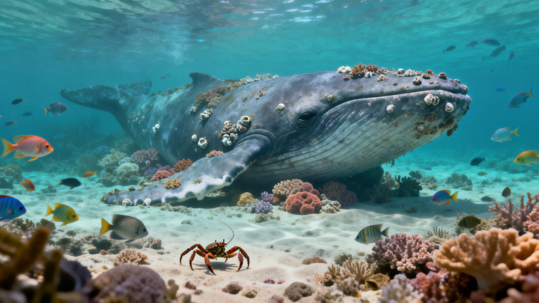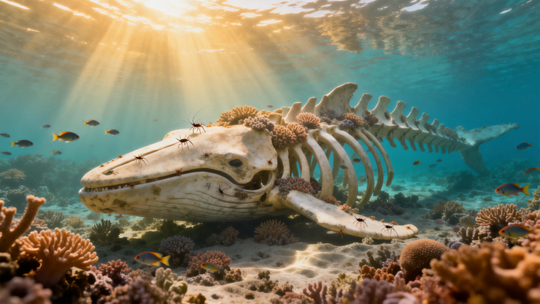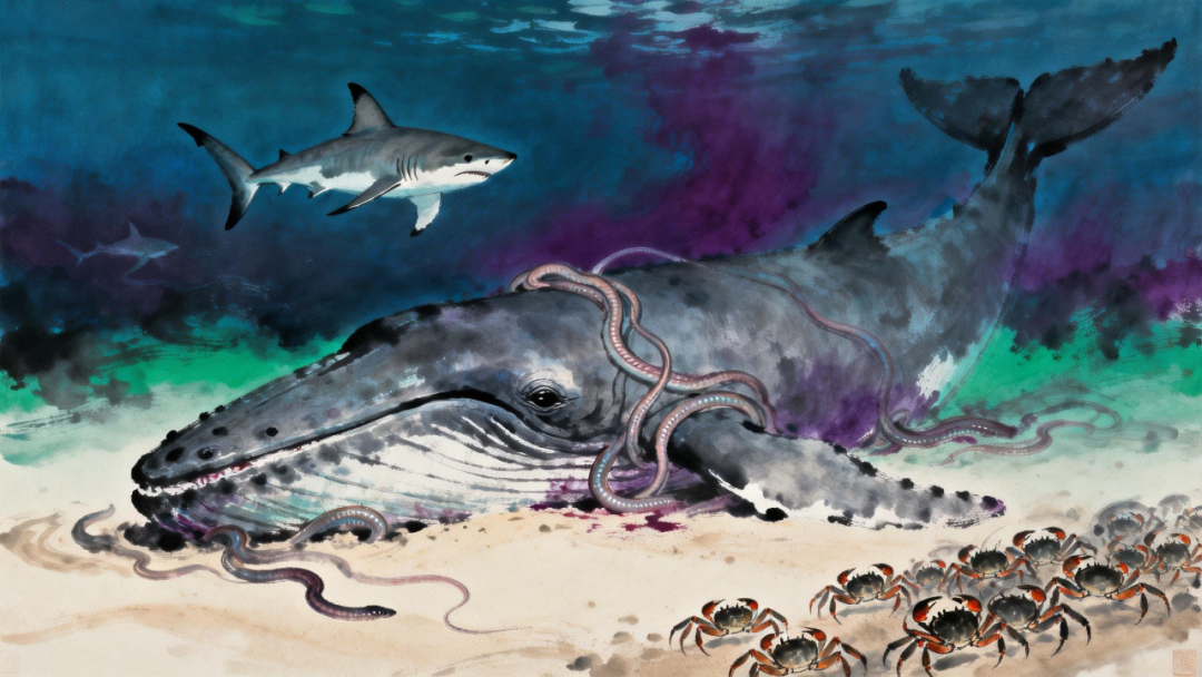 鲸死亡之后,尸体沉入海底,鲨鱼、盲鳗、螃蟹等“清道夫”闻香而来!它们大快朵颐,吃掉约90%的软组织。这场“盛宴”能持续4至24个月,加速了鲸遗体的分解。