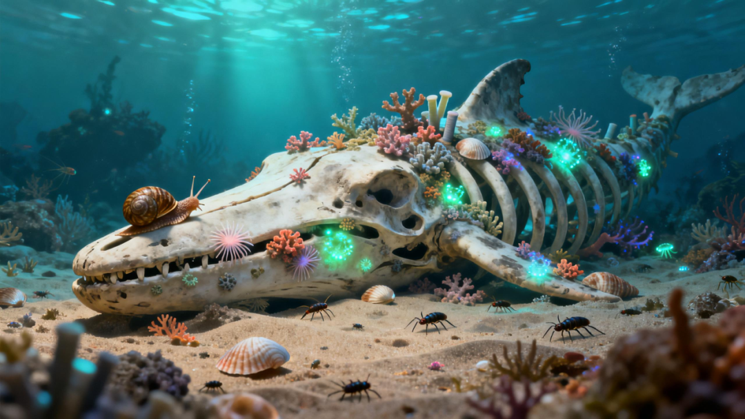 肉吃得差不多了?别急!“蜗牛”(腹足类)、“小虾”(甲壳类)、“小虫”(多毛类)等新居民搬进来住了!它们把鲸骨当成了“房子+食堂”,一边啃食残渣碎屑,一边在这里生儿育女,形成热闹的“深海社区”。