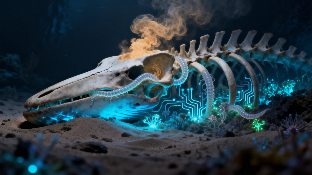 最神奇的部分来了!连骨头都不放过!食骨蠕虫和特殊的细菌合作,深入鲸骨内部,分解骨头里的油脂。分解过程中会产生有毒硫化氢,深海的微生物却有“黑科技”——它们能“吃”这种毒气来发电(获取能量)!这就像在漆黑的海底建起了一座神奇的“发电厂”,支撑起一个独特的微生物世界。这个阶段超长待机,能持续几十年甚至上百年!
