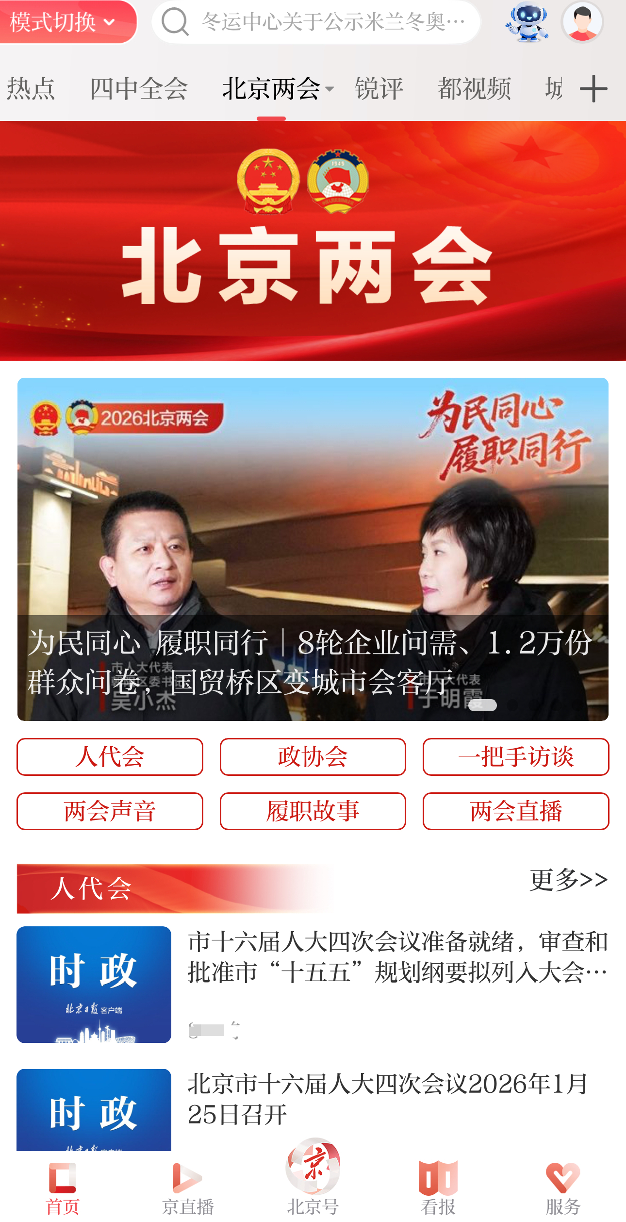 2026年北京市两会即将召开,为全面、及时、深入报道会议盛况,搭建市民与代表委员、政府部门沟通的桥梁,北京日报客户端上线“北京两会”频道,直播两会盛况、对话“一把手”、传递两会声音、讲述履职故事,共话首都发展。