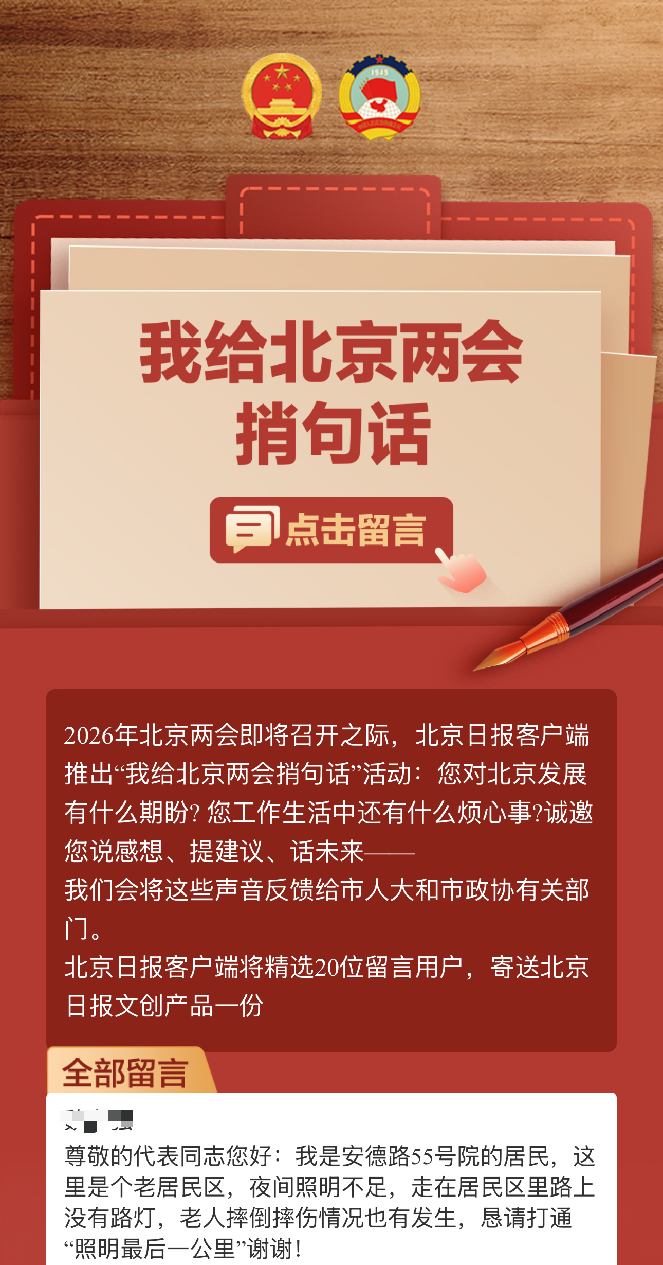 “我给北京两会捎句话”市民建言征集活动中的每一条宝贵意见,都将被汇总整理,送达市人大、市政协有关部门,成为决策参考的重要民意基础。为感谢积极参与,客户端还将精选20位留言用户,赠送北京日报特色文创礼品。