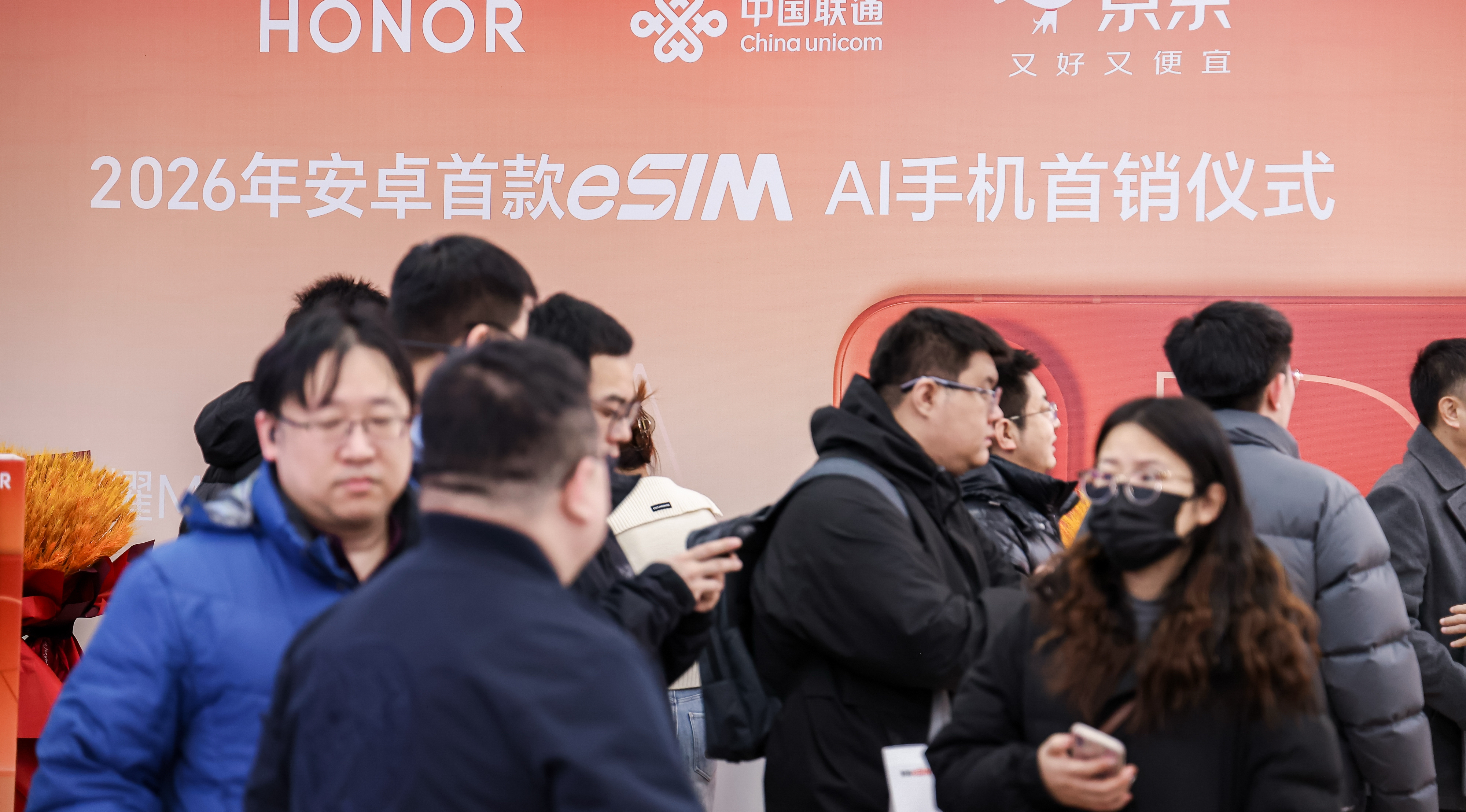 1月23日上午,荣耀首款eSIM手机Magic8 Pro Air在中国联通西单营业厅开启首销。北京市民陈先生一早来到现场领取自己预订的新机:“第一次用上eSIM手机,仅有155克重,手感很轻薄!”