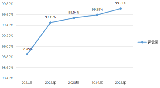 群众的法律咨询需求持续保持高位,12348热线通过强化培训指导、考核运用和约谈整改等措施,持续提升工作质效,电话接通率达到81.91%,较2024年提高了4.18个百分点,群众法律服务需求得到进一步满足。自2021年至2025年,群众对热线满意率逐年提升,2025年达到99.71%,较2024年又提高了0.12个百分点。收到群众表扬、感谢信等577件次。