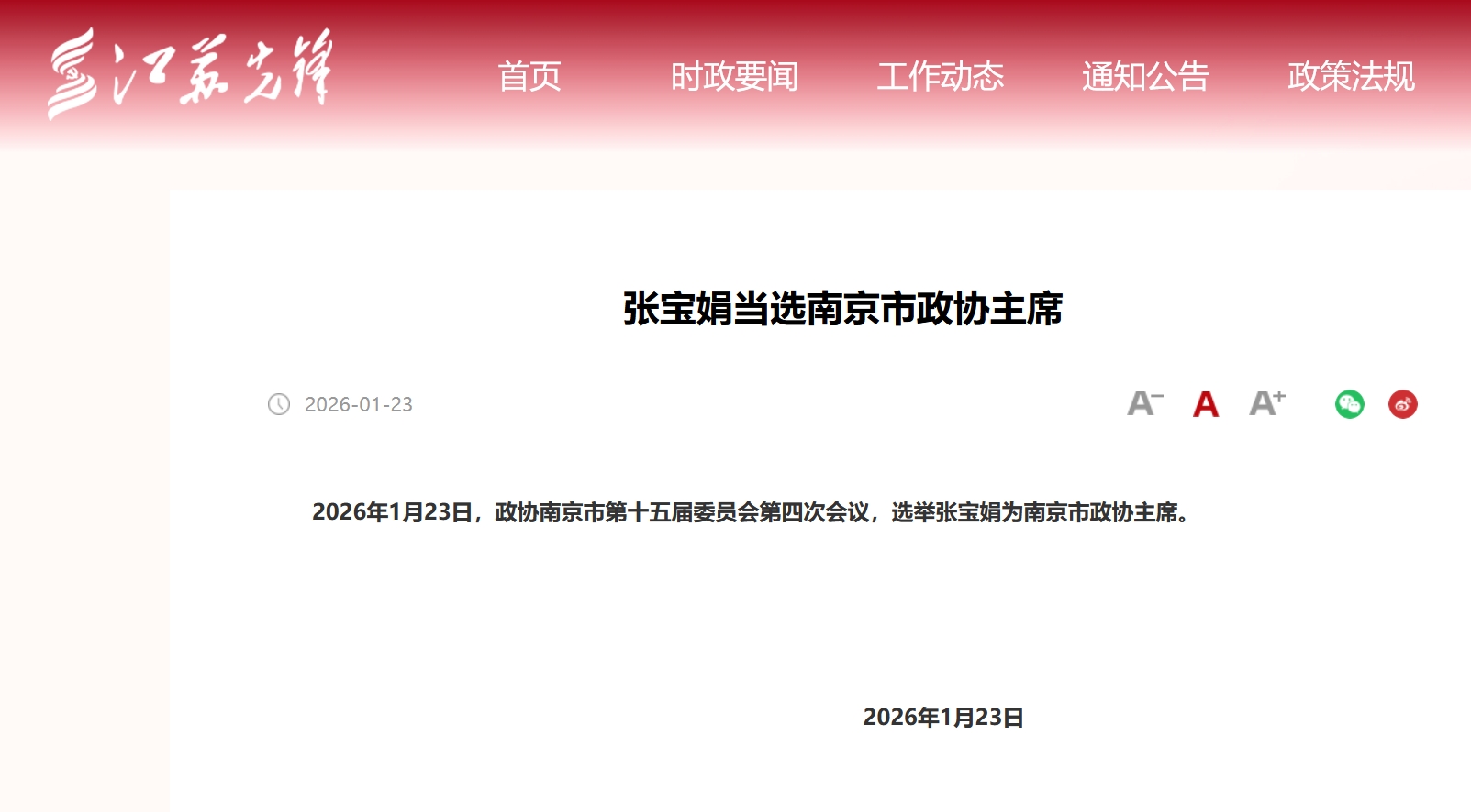 2026年1月23日,政协南京市第十五届委员会第四次会议,选举张宝娟为南京市政协主席。