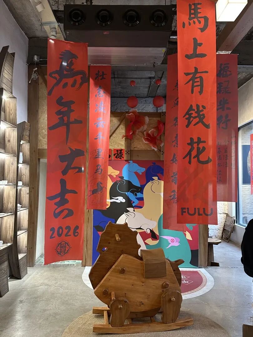 禄米仓胡同的几家咖啡小店,也换上了新春装扮。一家以“米仓”为主题的小店,大幅“金马送福”主题的红剪纸装点门楣,店内,巨幅春联搭配纯手工制作的木质“摇摇马”,打造成了一个专供顾客打卡拍照的区域。“我们早早布置,想让大家提前感受过年的氛围。从元旦开始,就有好多顾客穿着喜庆的服装,来这儿排队拍照打卡呢!”店员说。