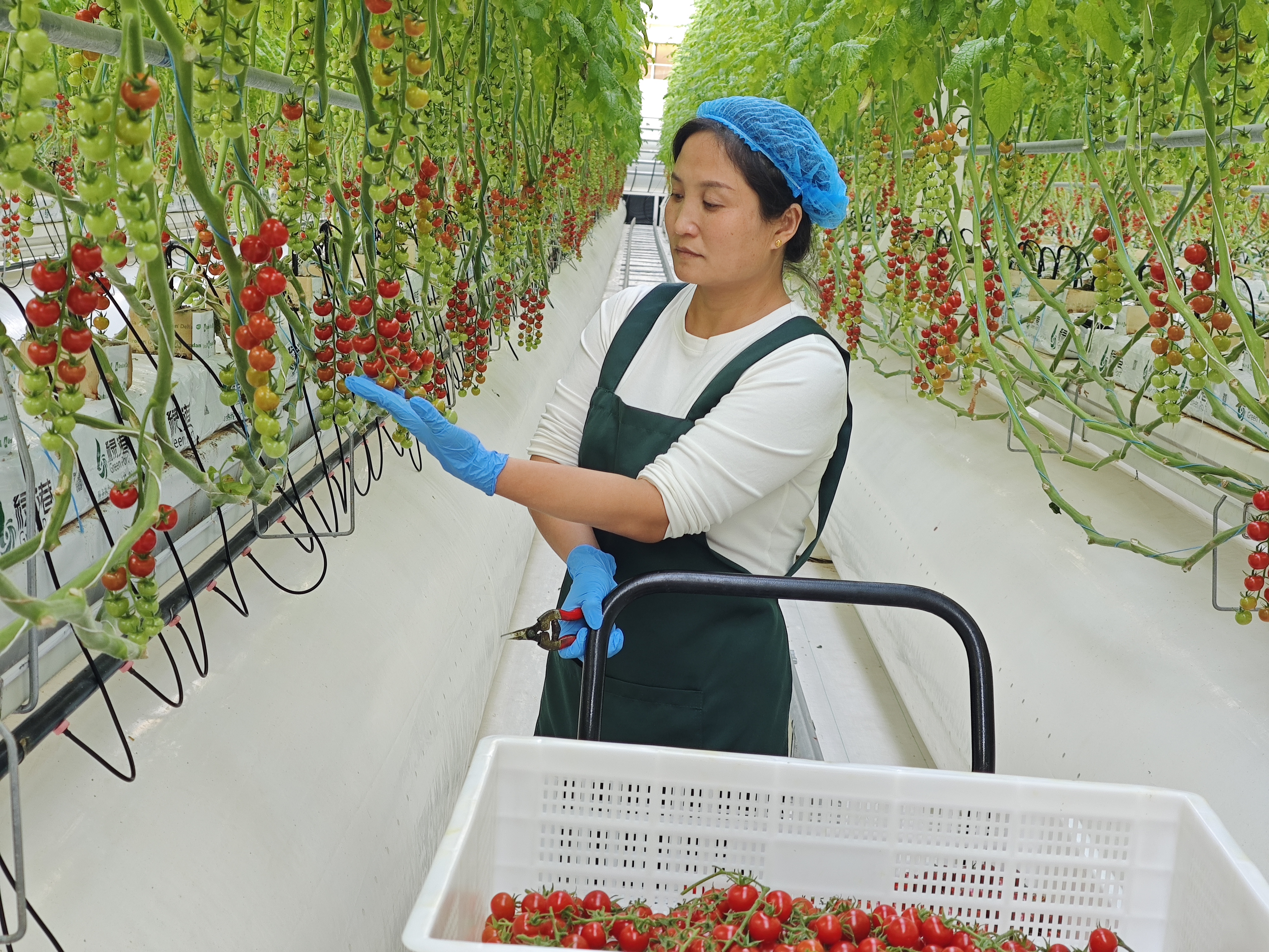 徐娜手持专用剪刀,穿梭其中,早就掌握了采摘和选品的技巧。看着成熟的小番茄,徐娜说:“每串在10个果以上,对称均匀,单果在10克以上,就是一级品。每个果的价格比一个鸡蛋都贵!”徐娜每天骑电动车5分钟上班,一天工作8小时。在“家门口”上班,不仅没有风吹日晒,工作强度也不大,还有一份可观的收入,简直太幸福了。
