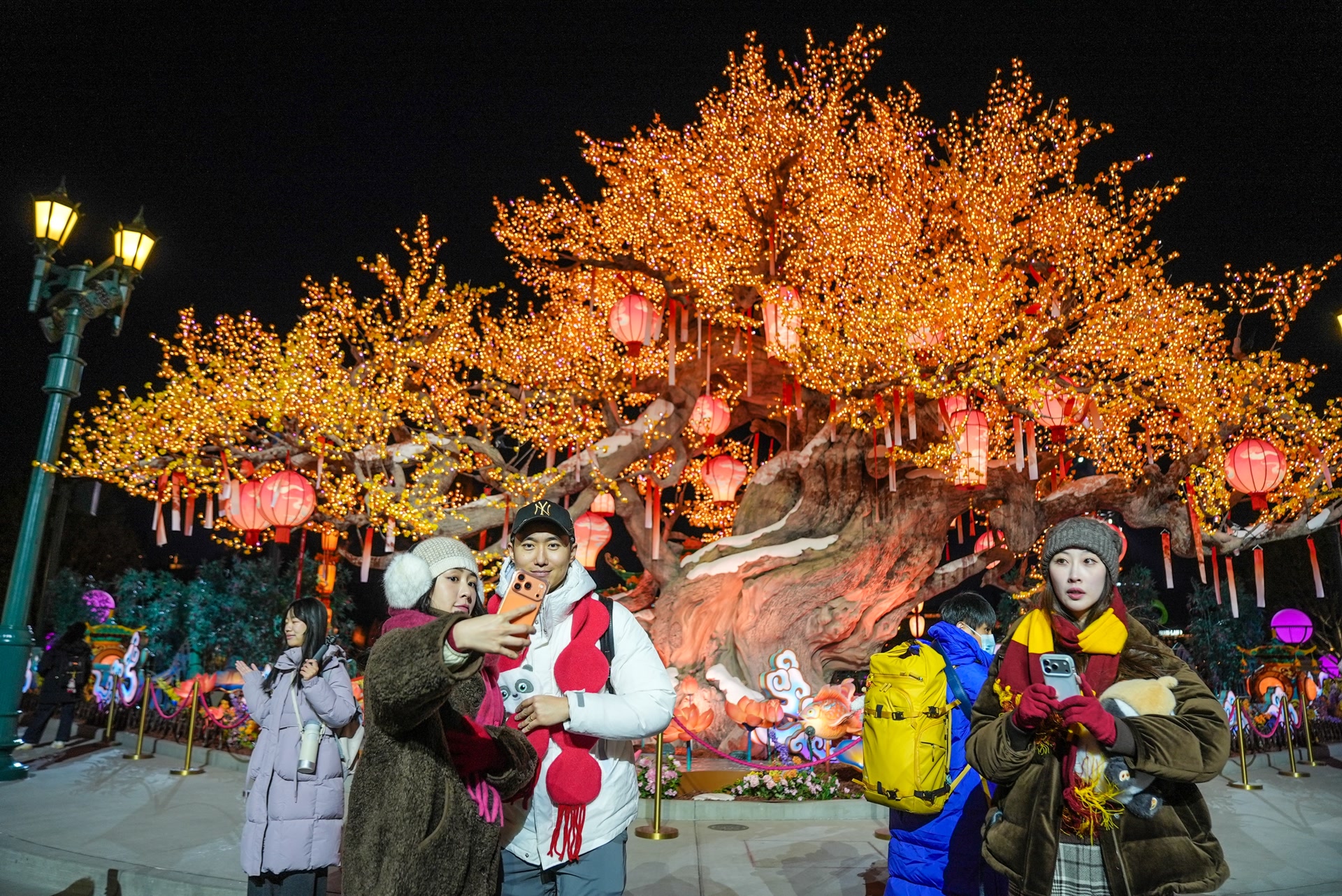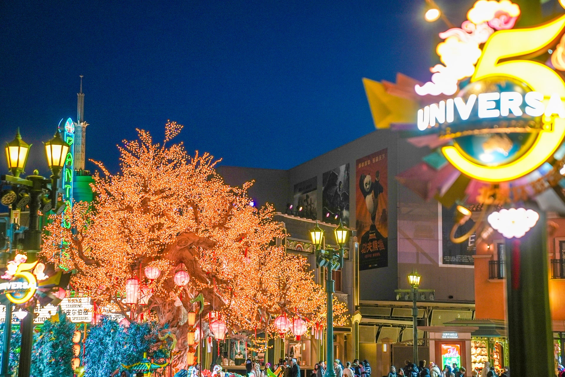 主题公园内,好莱坞大道尽头的蓝贡湖畔,“环球中国年”标志性景观——环球绮愿金梅树升级亮相。夜幕降临,美轮美奂的环球绮愿金梅树点亮,不少身着新春服饰的游客在这里打卡、祈福。好莱坞大道两旁,史瑞克、费欧娜、穿靴子的猫和软爪吉蒂、啄木鸟伍迪与温妮等明星角色换上华丽的节庆新装,与游客惊喜“偶遇”。在小黄人乐园,小黄人们换上马年新造型,热情邀请游客互动。