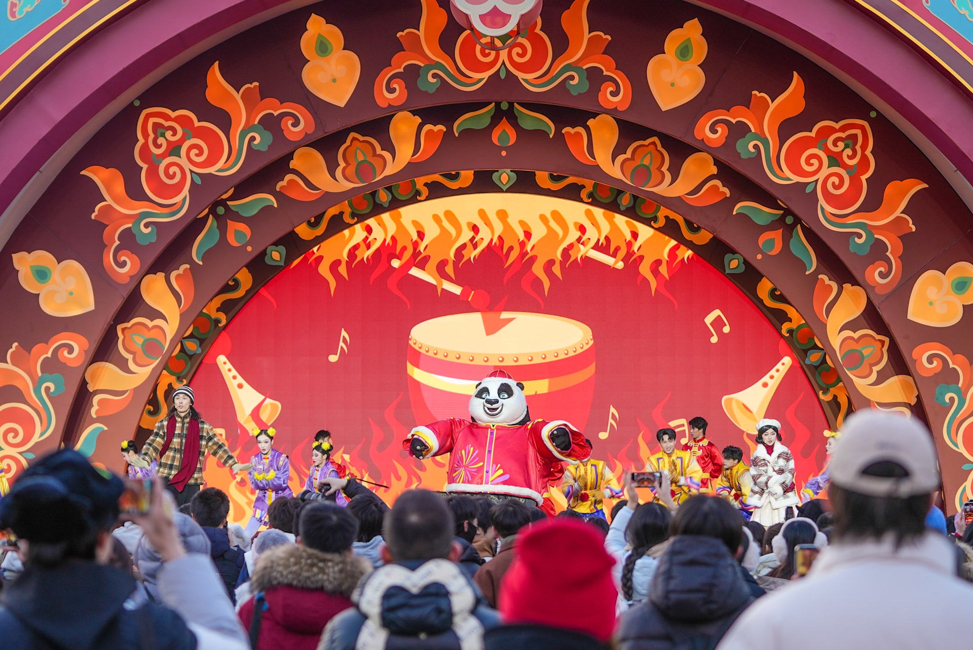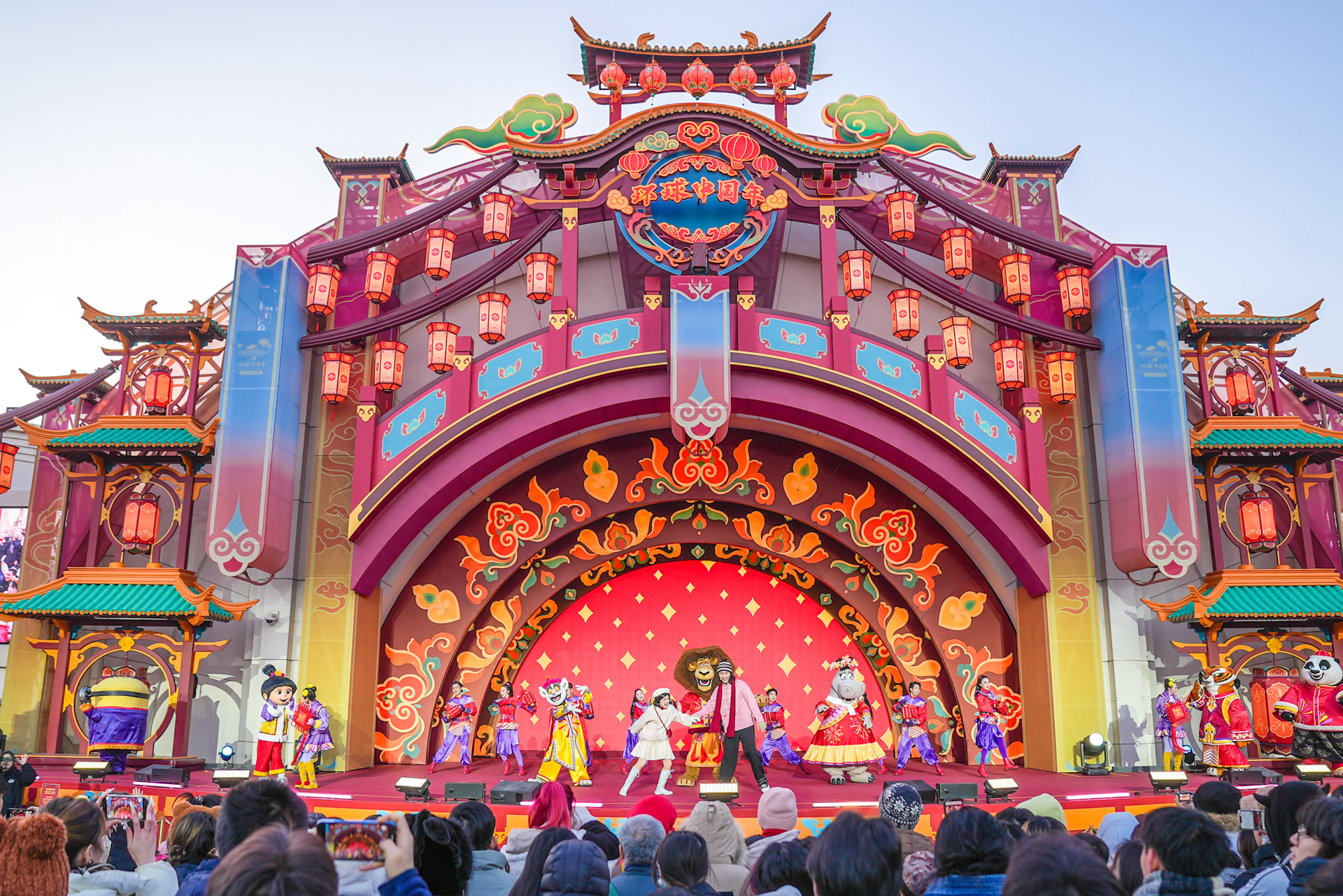 爆肚粉、肉丝煎饼、绿豆糕、糖人、糖葫芦……坐落于好莱坞剧场的环球新春广场烟火气升腾,大批游客在此开启“逛吃”模式,等待着观看环球中国年新春特别演出。今年的演出以《团圆啦!》为名崭新回归,带来全新编舞与音乐,《功夫熊猫》的阿宝、《马达加斯加》的朱利安国王、《神偷奶爸》的小黄人等14位明星角色悉数登场,传统艺术表演元素迎来全新升级,融入了刀马旦、川剧变脸、蹬鼓杂技等形式。演出结尾部分,绚丽的彩带漫天飞舞,现场尖叫声欢呼声连连,游客们纷纷按下相机快门,记录下这一难忘时刻。