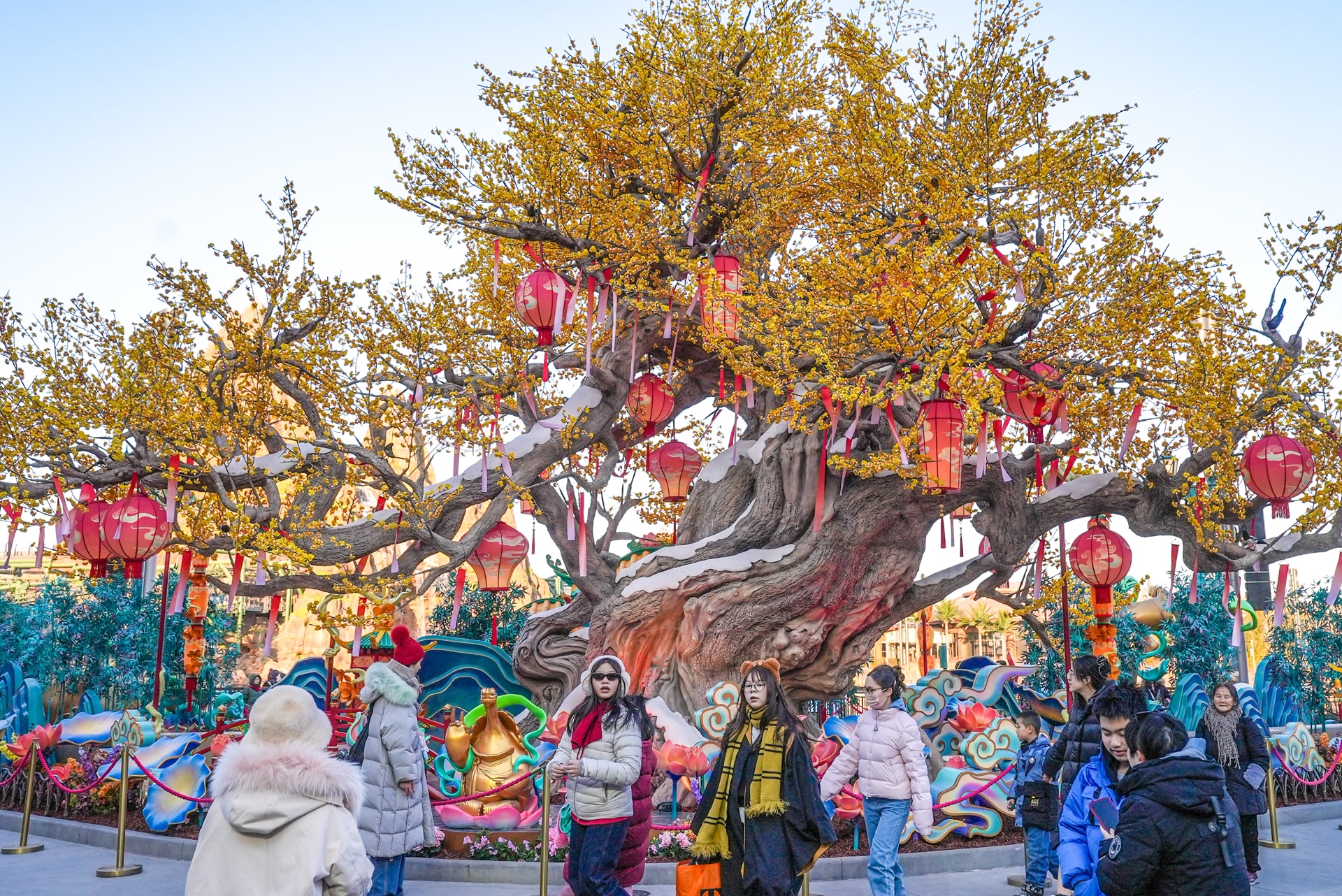 刚刚步入北京环球城市大道,欢快的新春音乐传入耳畔,大道两侧,祥云等新春元素装饰的道旗与大红灯笼相得益彰,将浓郁的新春气氛传递给每一位即将入园的游客,标志性的旋转地球雕塑前围满了拍照打卡的游客。