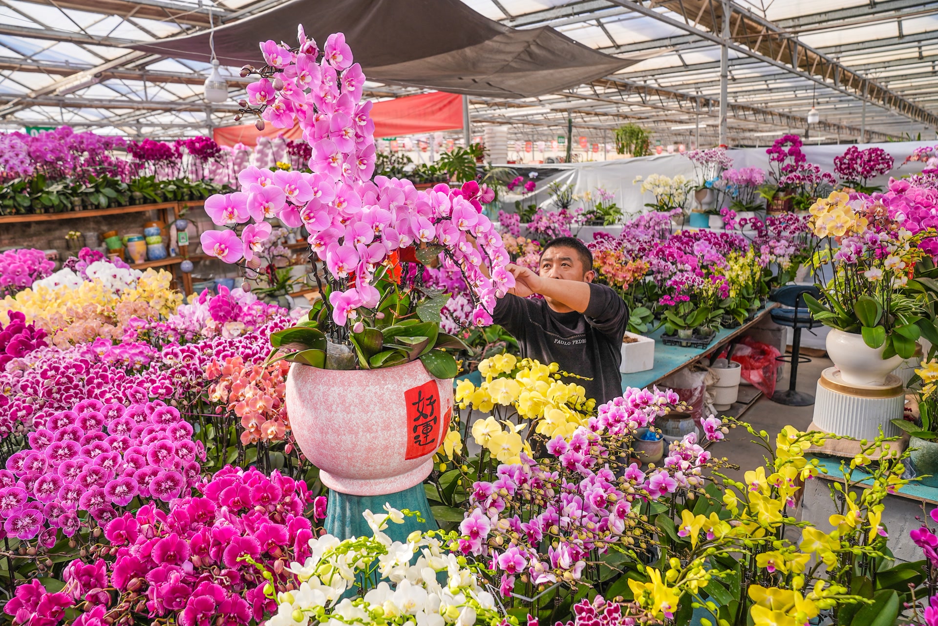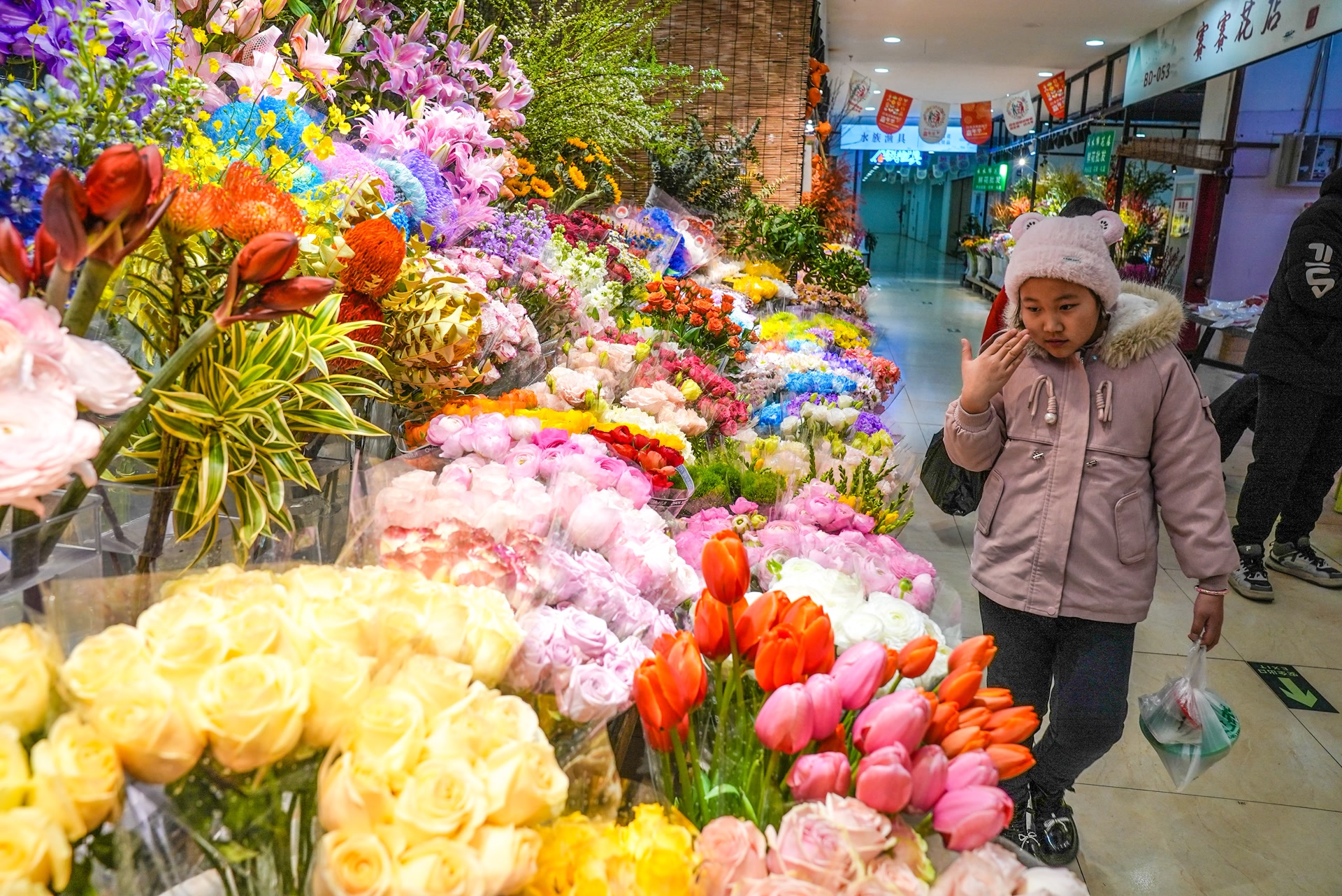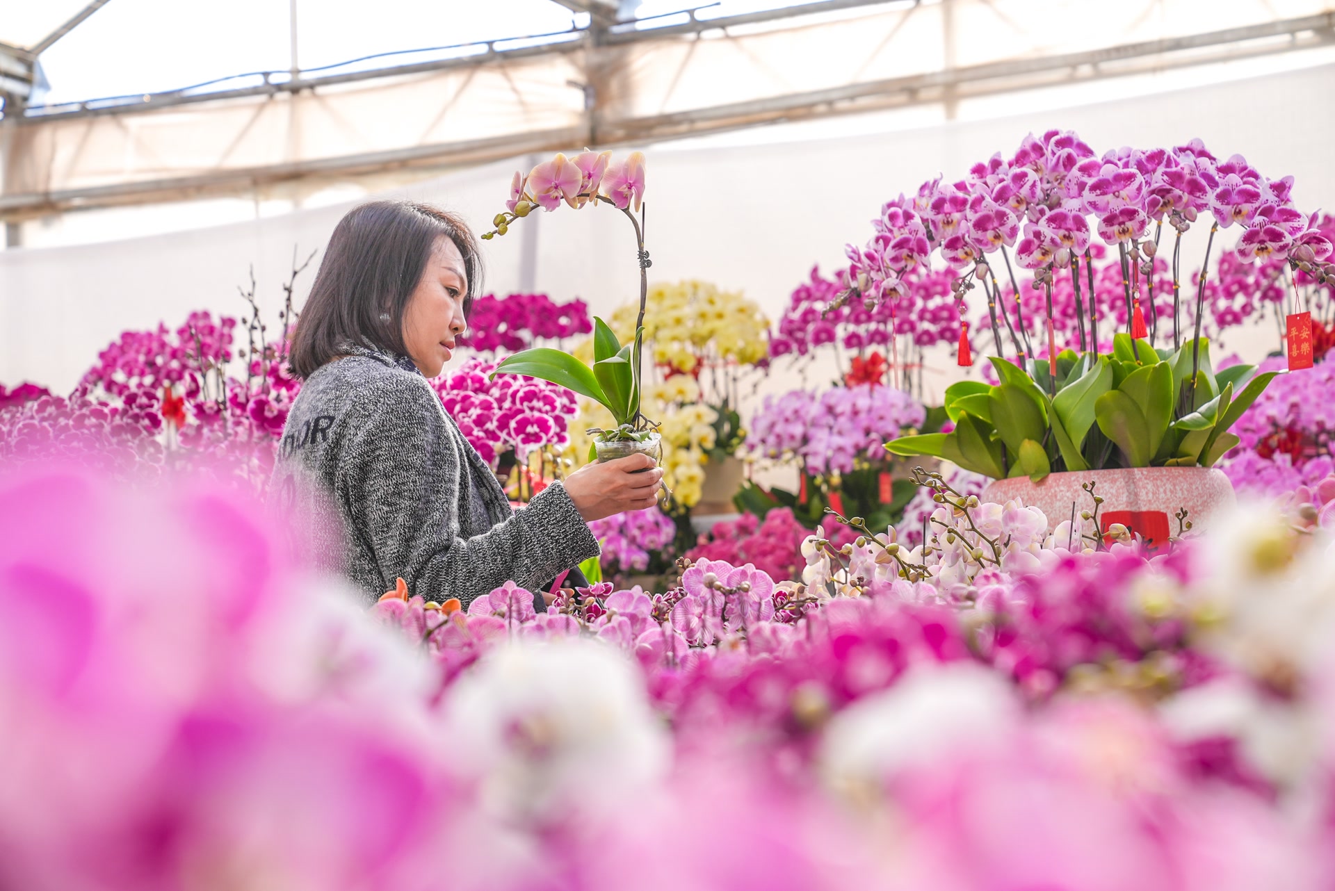 作为顺义区重要的花卉集散交易中心,位于北京东北部的国门1号花卉市场在年宵花旺季人气十足。市场经营面积超过1万平方米,汇集了年宵花卉、鲜切花、观赏绿植盆栽等三大类别、超过200种花卉绿植。从象征富贵的蝴蝶兰、大花蕙兰,到表达爱意的玫瑰、百合,再到寓意吉祥的发财树以及萌萌的多肉植物,能满足消费者装饰家居、馈赠亲友、日常观赏的多样化需求。