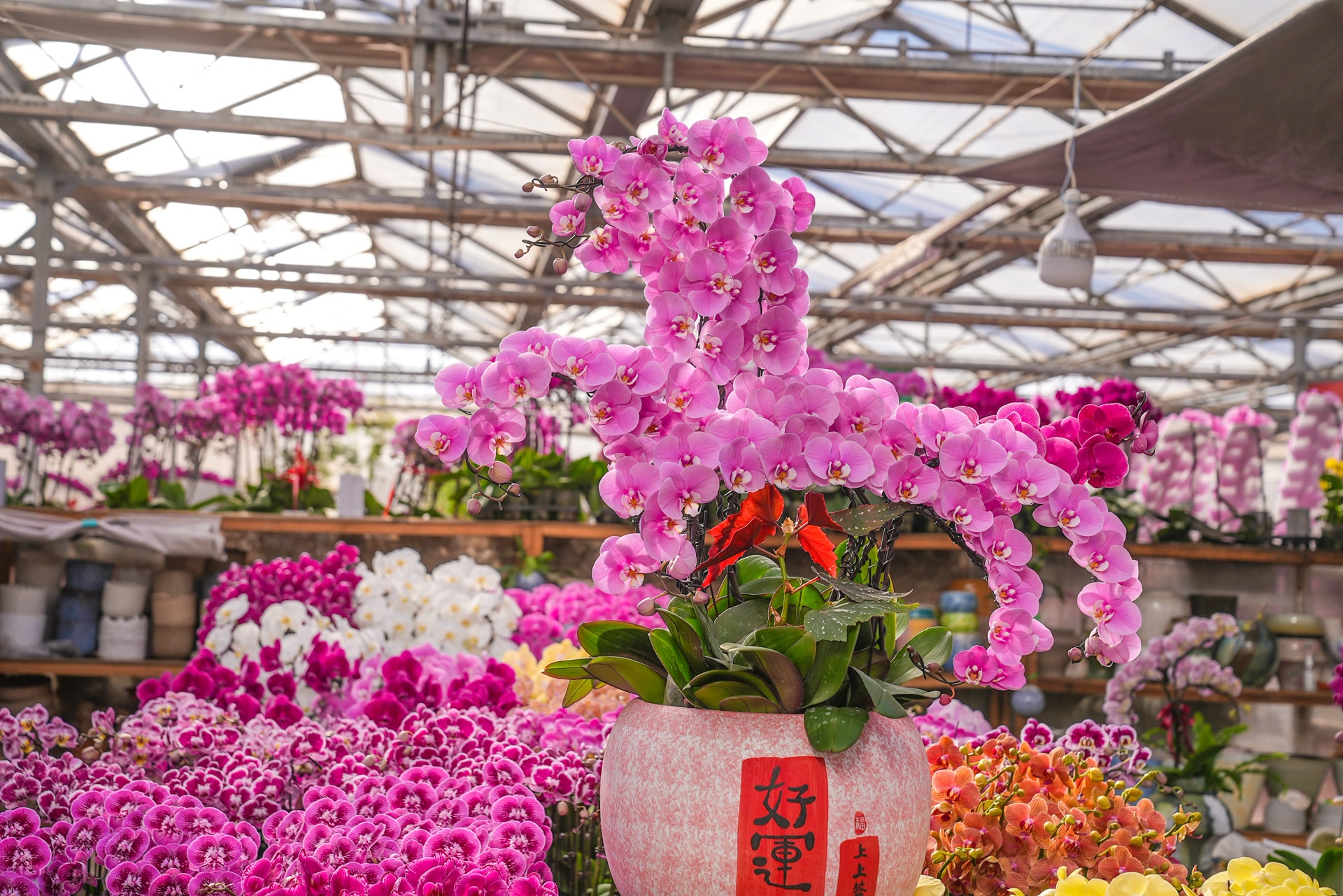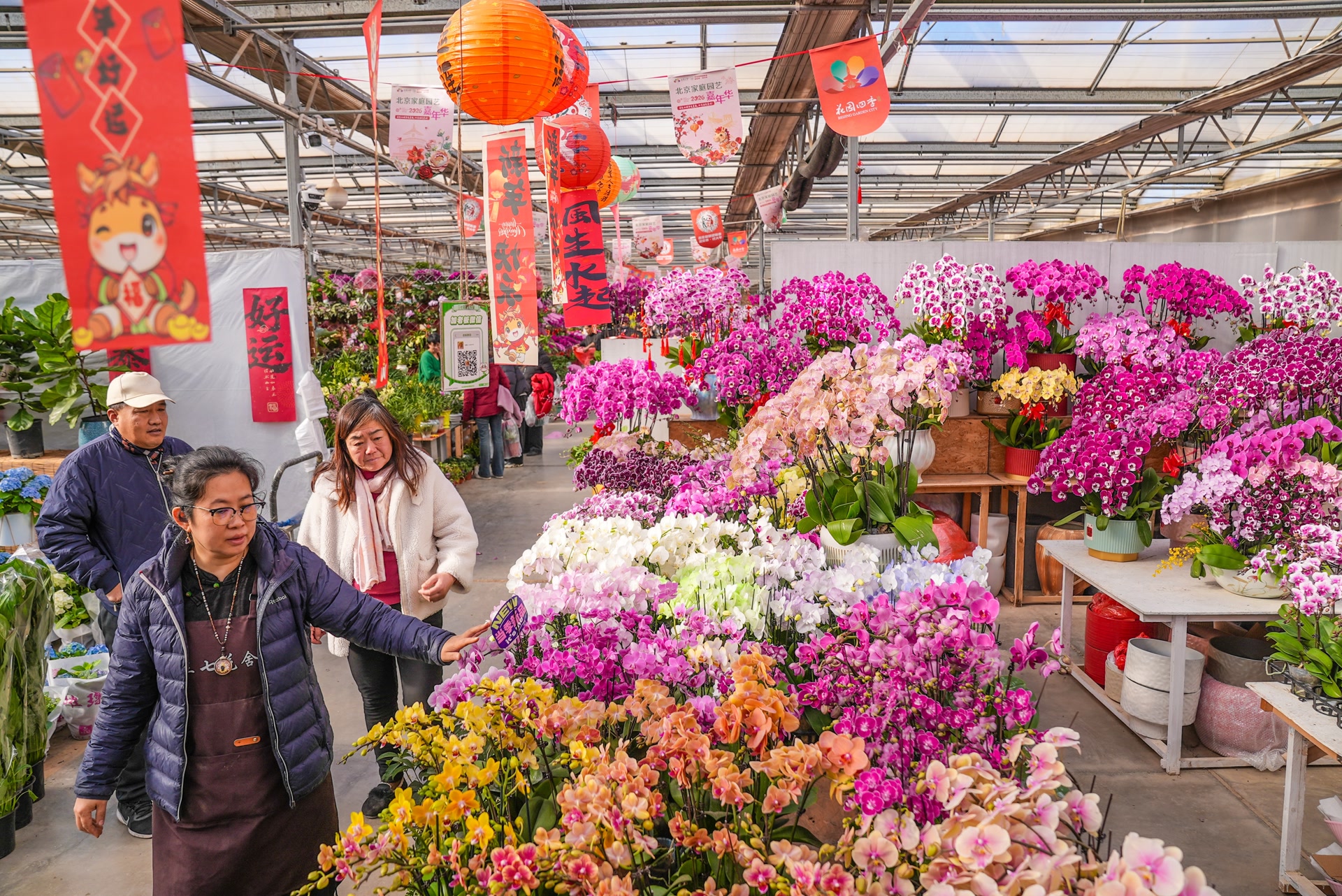 位于顺义区赵全营镇的北郎中花木中心,是北京市花卉生产标准化基地。今年,中心以500亩露天种植区和10万平方米智能温室为依托,精心打造了年宵花主题展览,活动将一直持续至4月初。展区内,蝴蝶兰、三角梅等主打年宵花卉在绿意盎然的景观衬托下竞相绽放,生机勃勃,驱散冬日寒意。