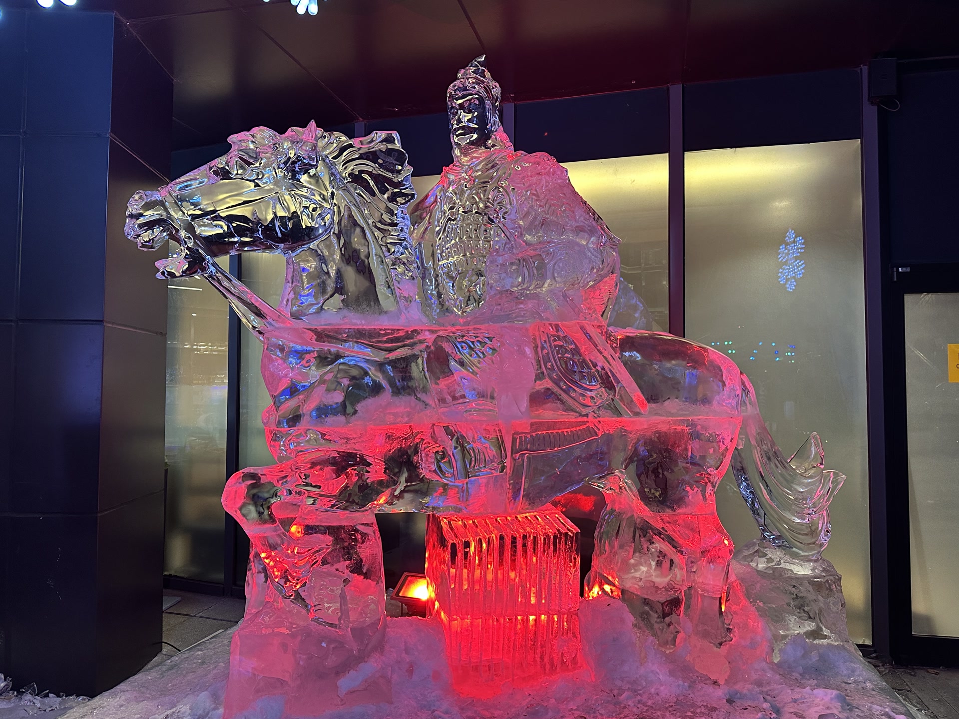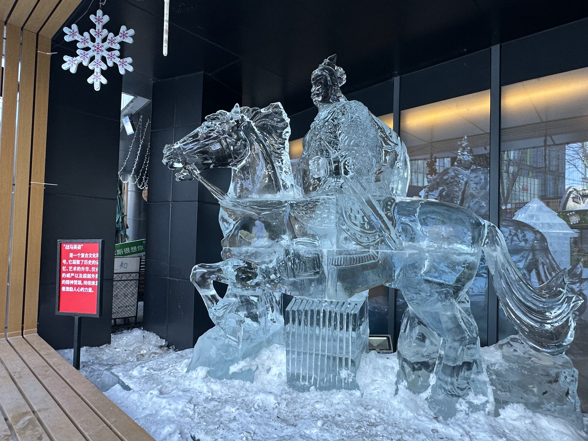 下沉广场是冰雕展的核心打卡区,各式冰雕造型别致、寓意美好。中部的冰灯城堡形似饱满的粮仓,寄托着丰收富足的期许。遍布街区各个角落的马年主题冰雕,以多样姿态展示传统生肖文化,将颇具巧思的美好寓意藏于冰雕之中。“双马祈福”的卡通萌马守护着冰元宝,尽显喜庆;“战马英姿”的威严战马驮着铠甲将军,尽显豪迈;“马上有钱”“马上封侯” 冰雕则分别以马背驮铜钱、猴子的造型,传递着“招财进宝”“事业有成”的祝福。