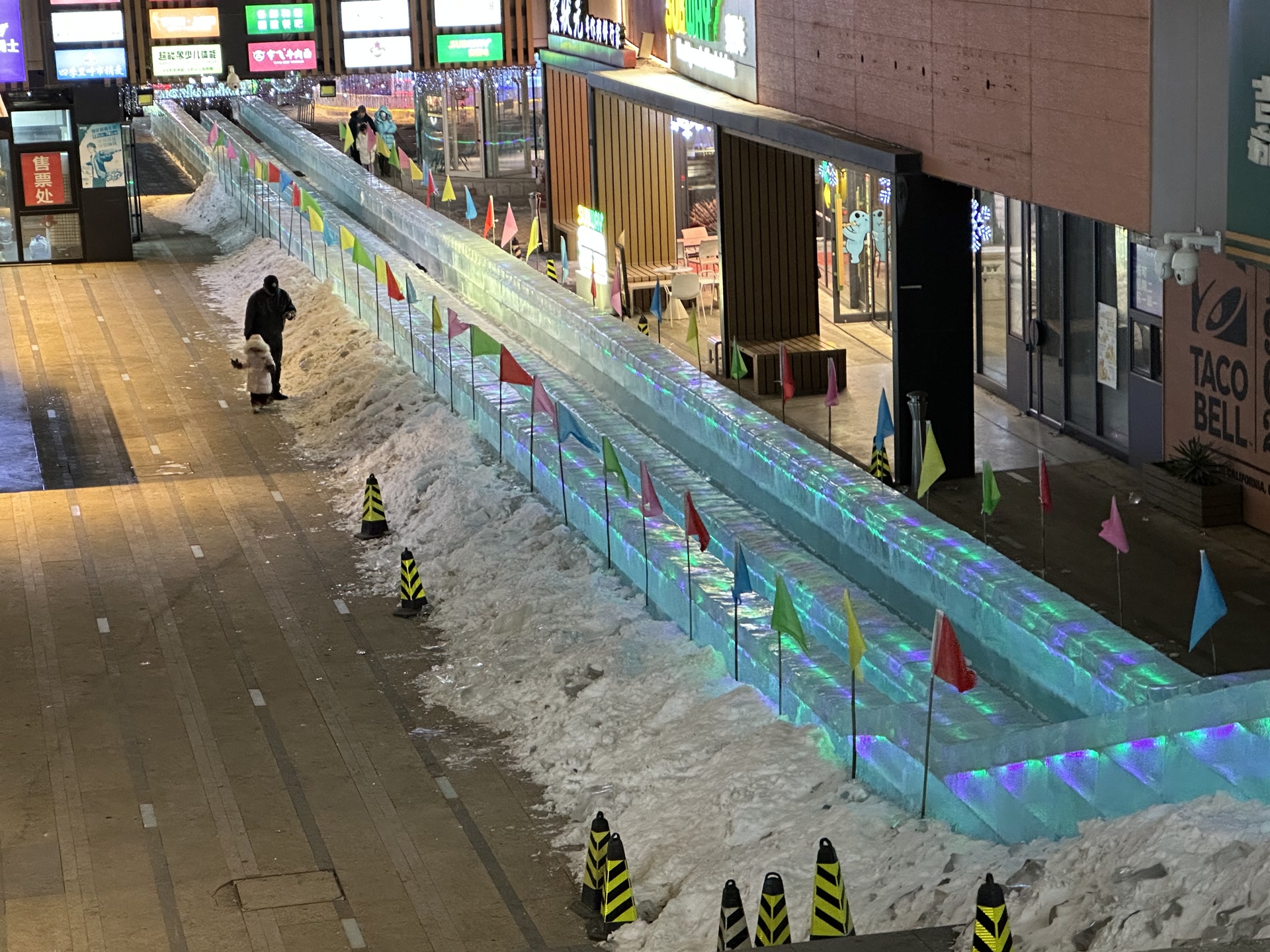 东侧的冰滑梯成为人气聚集地,欢乐满满。孩子们裹着厚实棉衣,坐着塑料滑板从滑梯顶部一冲而下,清脆的欢笑声穿透寒风。“爸爸,我还要再滑一次!”有孩子滑下后直呼过瘾,立马拖着滑板准备再次体验。现场工作人员介绍,今年的冰滑梯全新升级,全长110米且设置双滑道,夜晚滑梯两侧还会亮灯,开放时间至每晚9时。