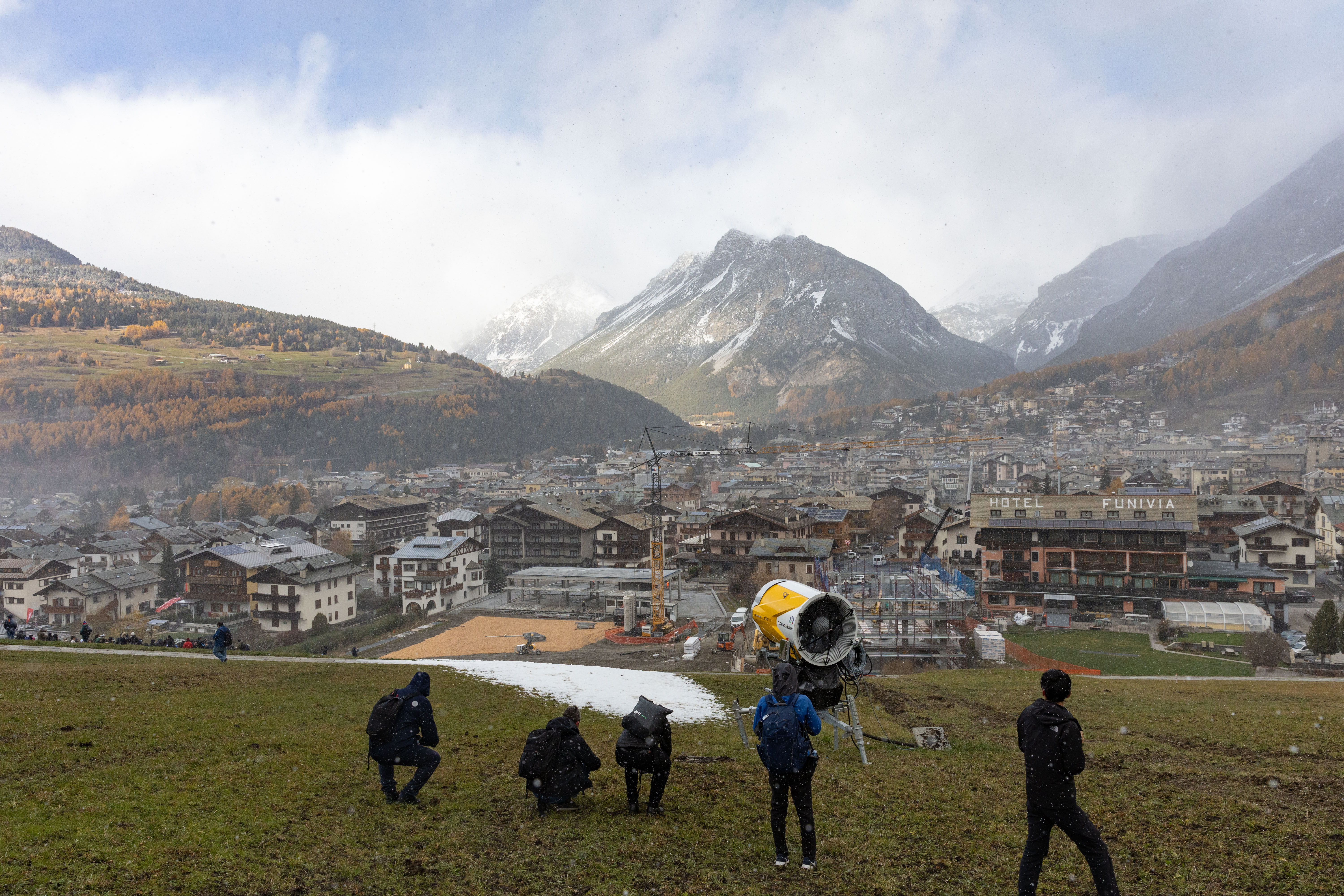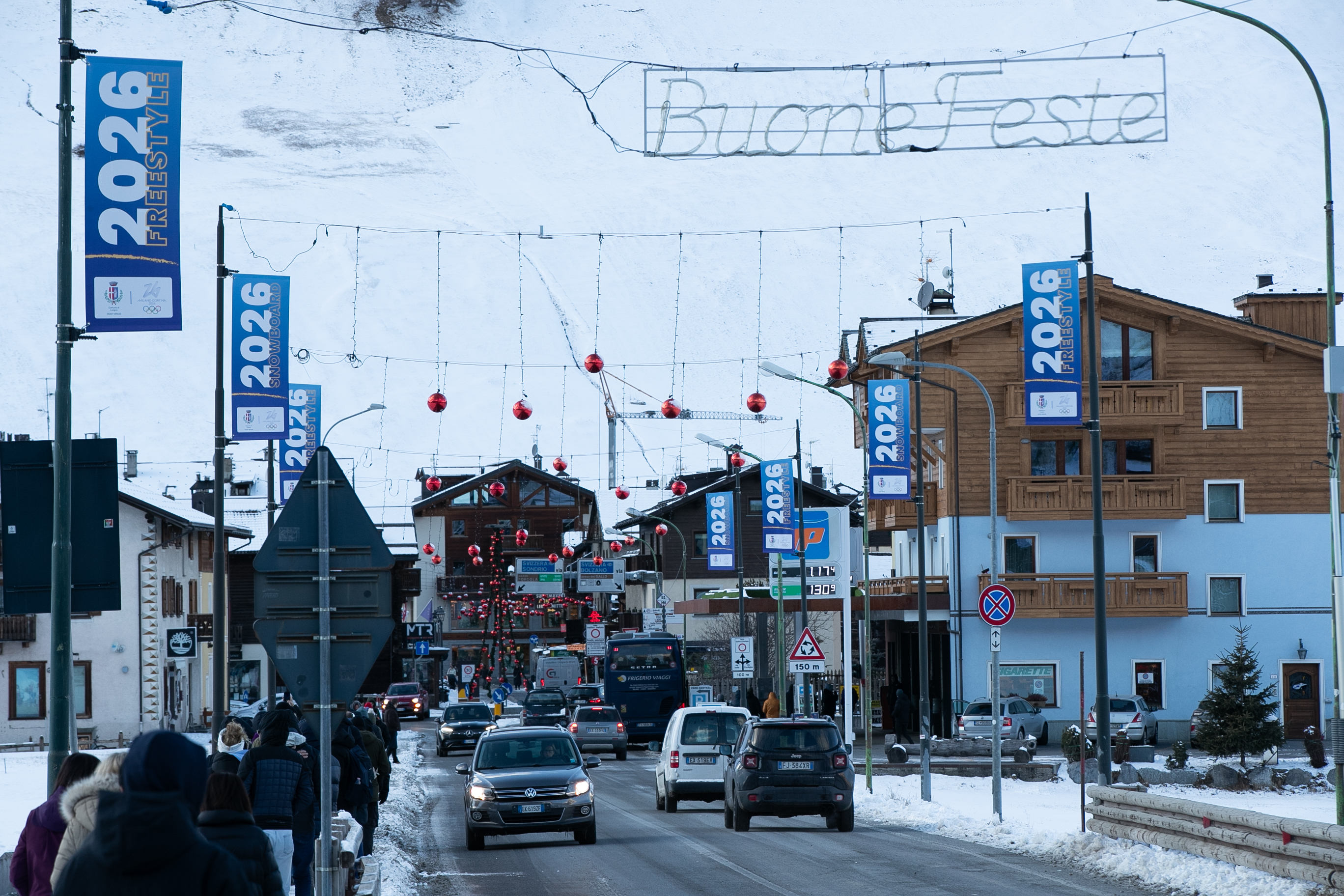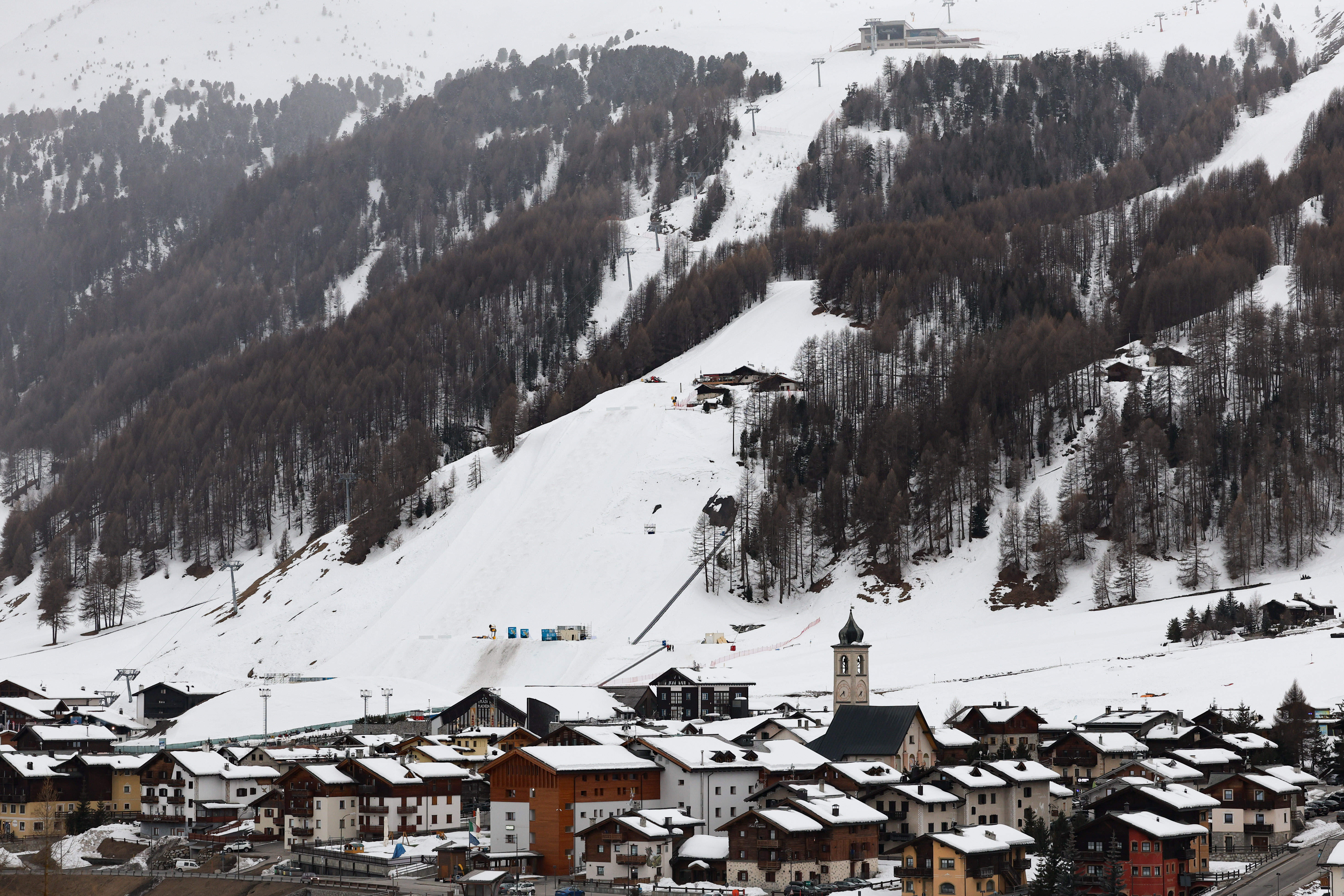 ↑ 2025年在意大利利维尼奥镇,运动员在利维尼奥空中及雪上技巧公园训练。