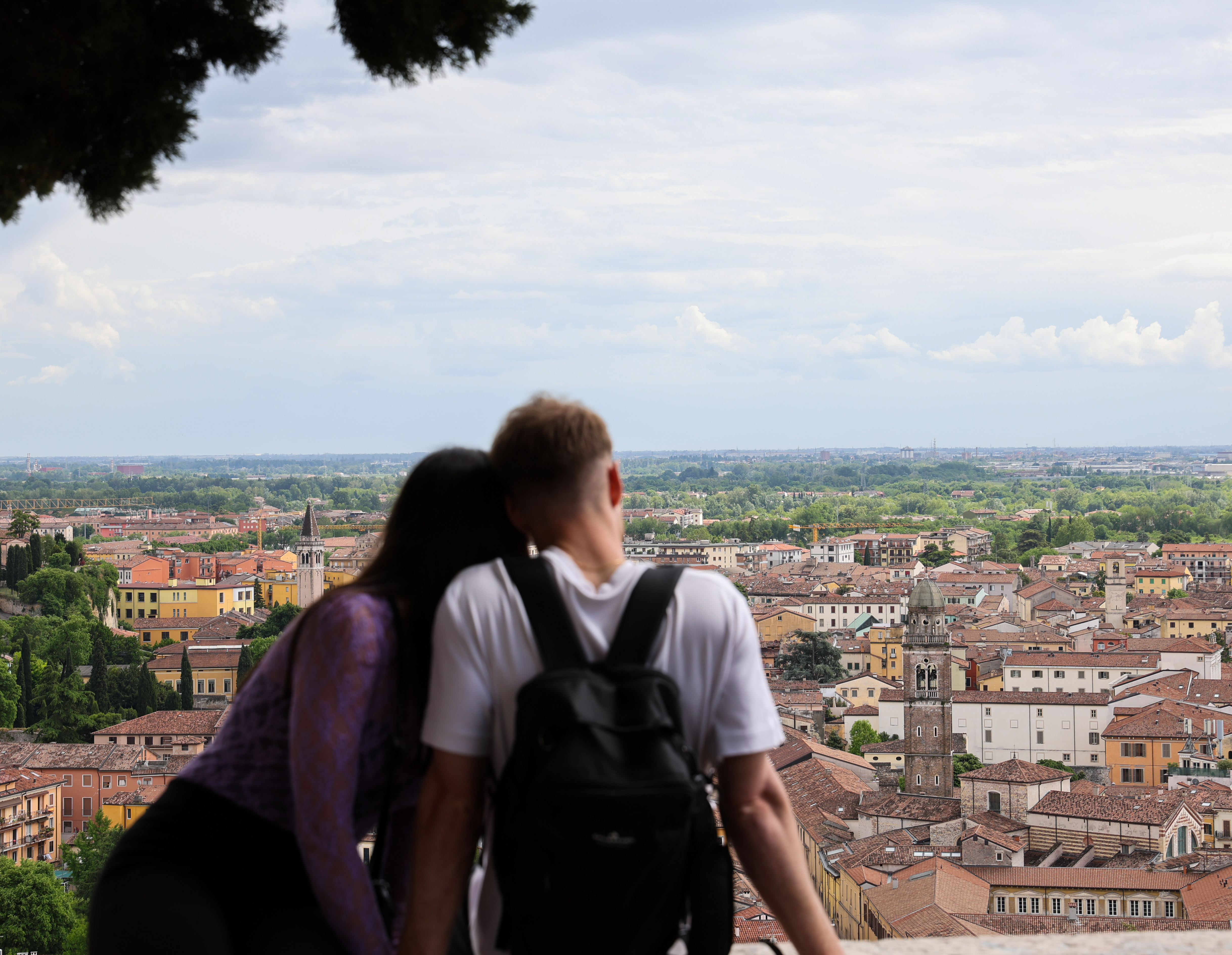 ↑ 2025年在意大利维罗纳,一对情侣在圣彼得城堡休闲。维罗纳位于意大利北部威尼托大区,2000年被联合国教科文组织列入《世界遗产名录》。罗马式的圆形竞技场是这座城市的标志性建筑,它是世界上现存的第三大圆形竞技场,2026年米兰-科尔蒂纳冬奥会闭幕式将在这里举行。