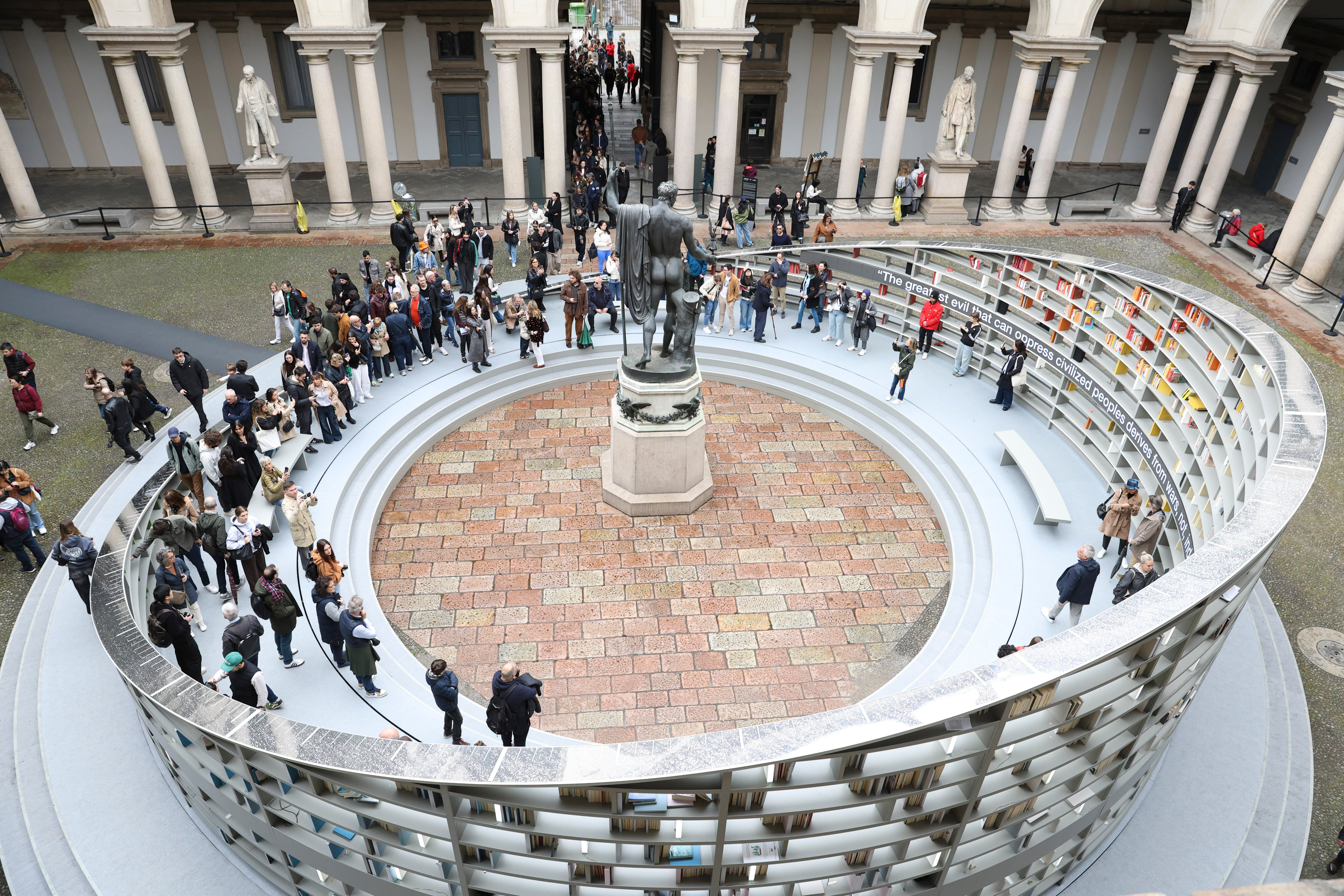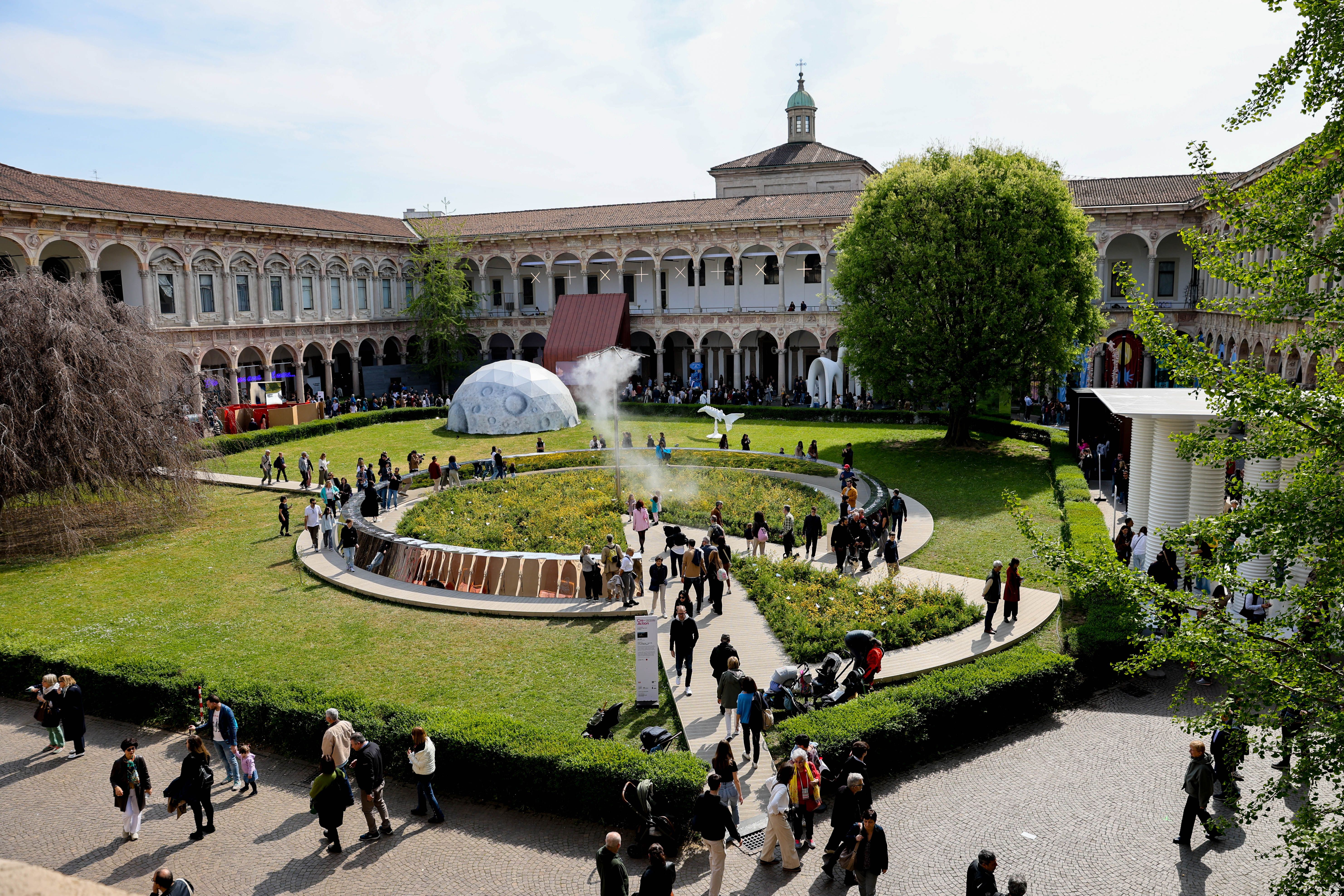 ↑ 2025年在意大利米兰国立大学,人们参观米兰设计周展品。