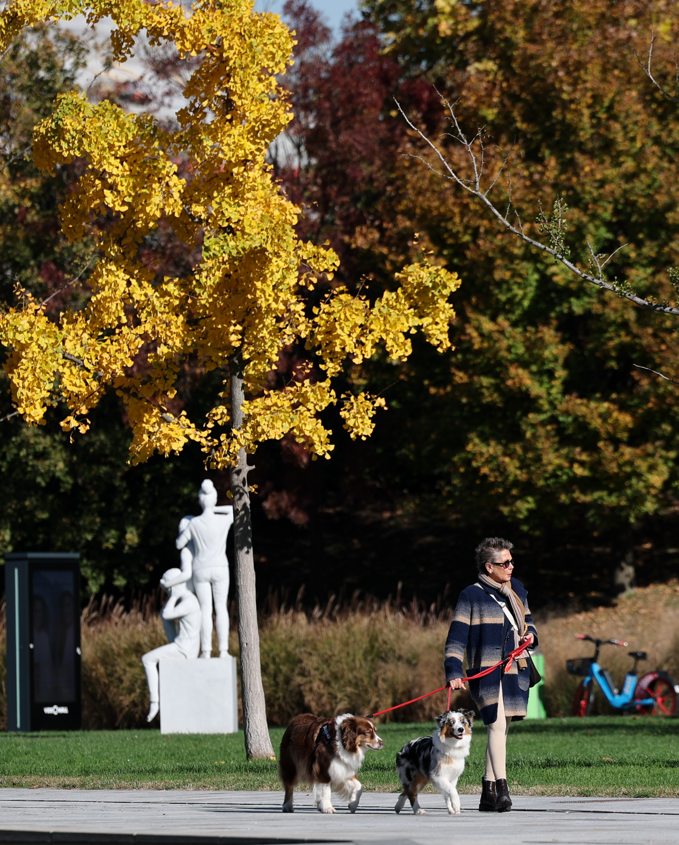 ↑ 2025年在意大利米兰,市民在城市生活区遛狗。