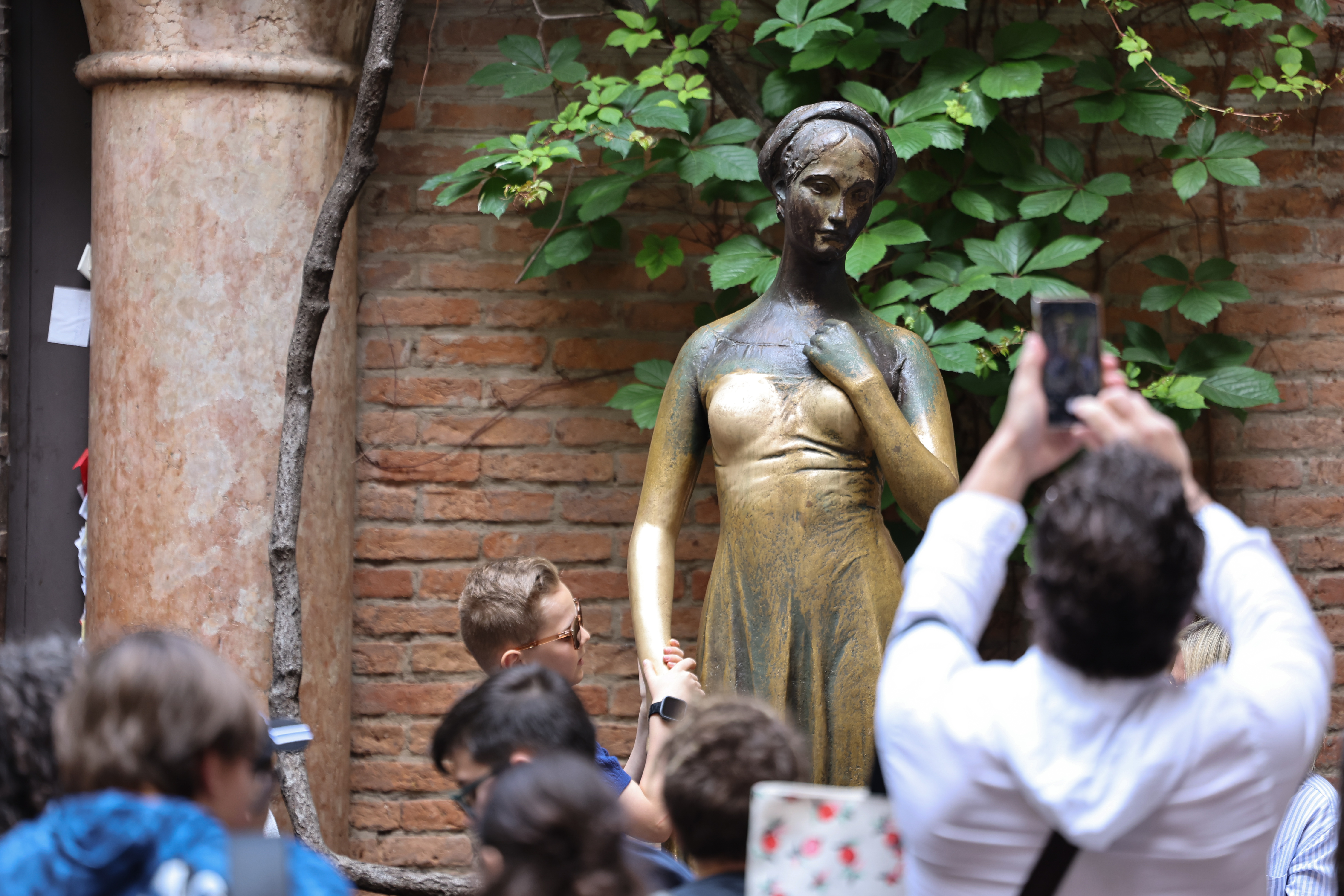 ↑ 2025年在意大利维罗纳朱丽叶故居,人们与朱丽叶雕像留影。