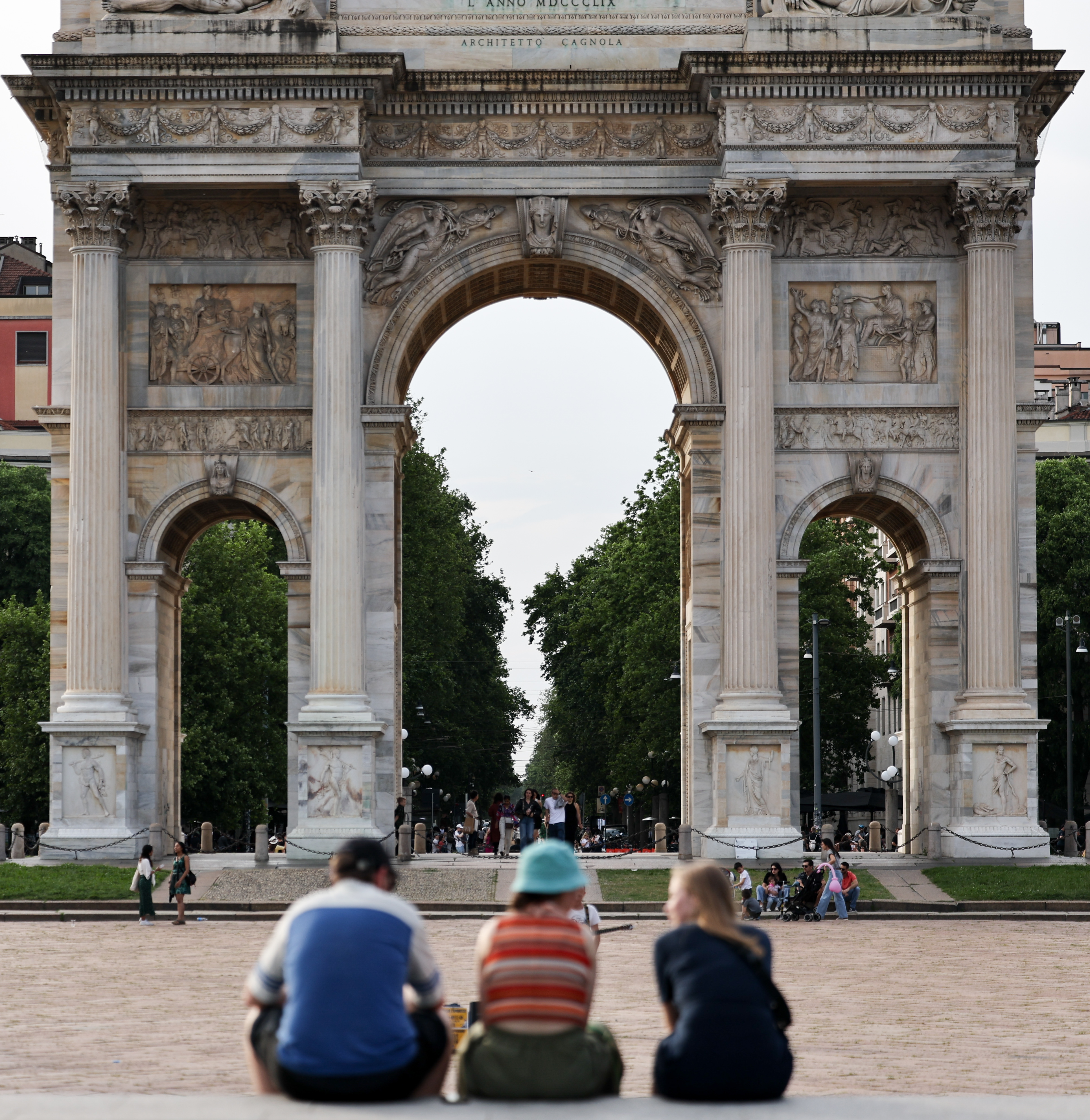 ↑ 2025年在意大利米兰,人们在和平之门前休闲游玩。