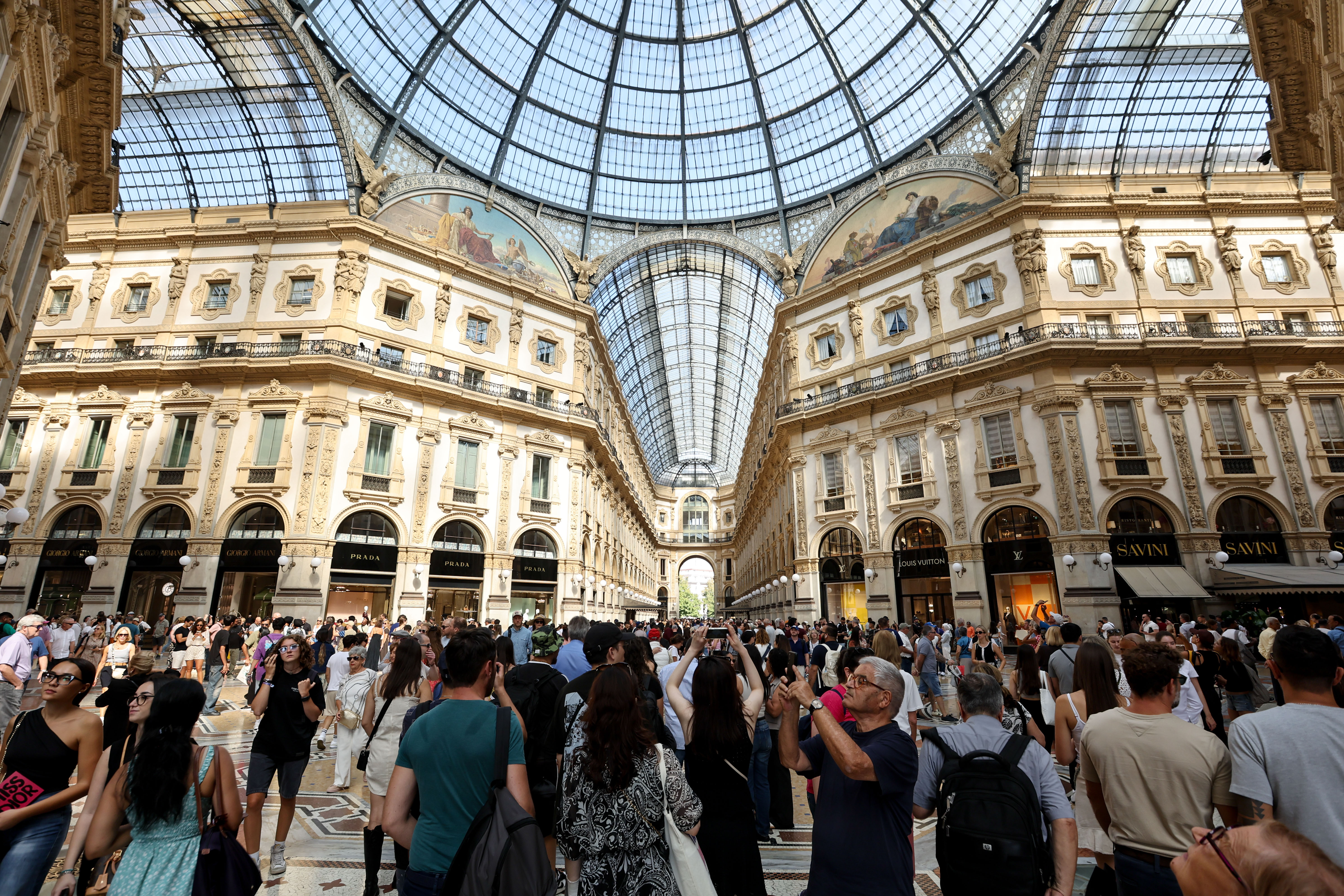 ↑ 2025年在意大利米兰,人们在埃马努埃莱二世拱廊游玩。