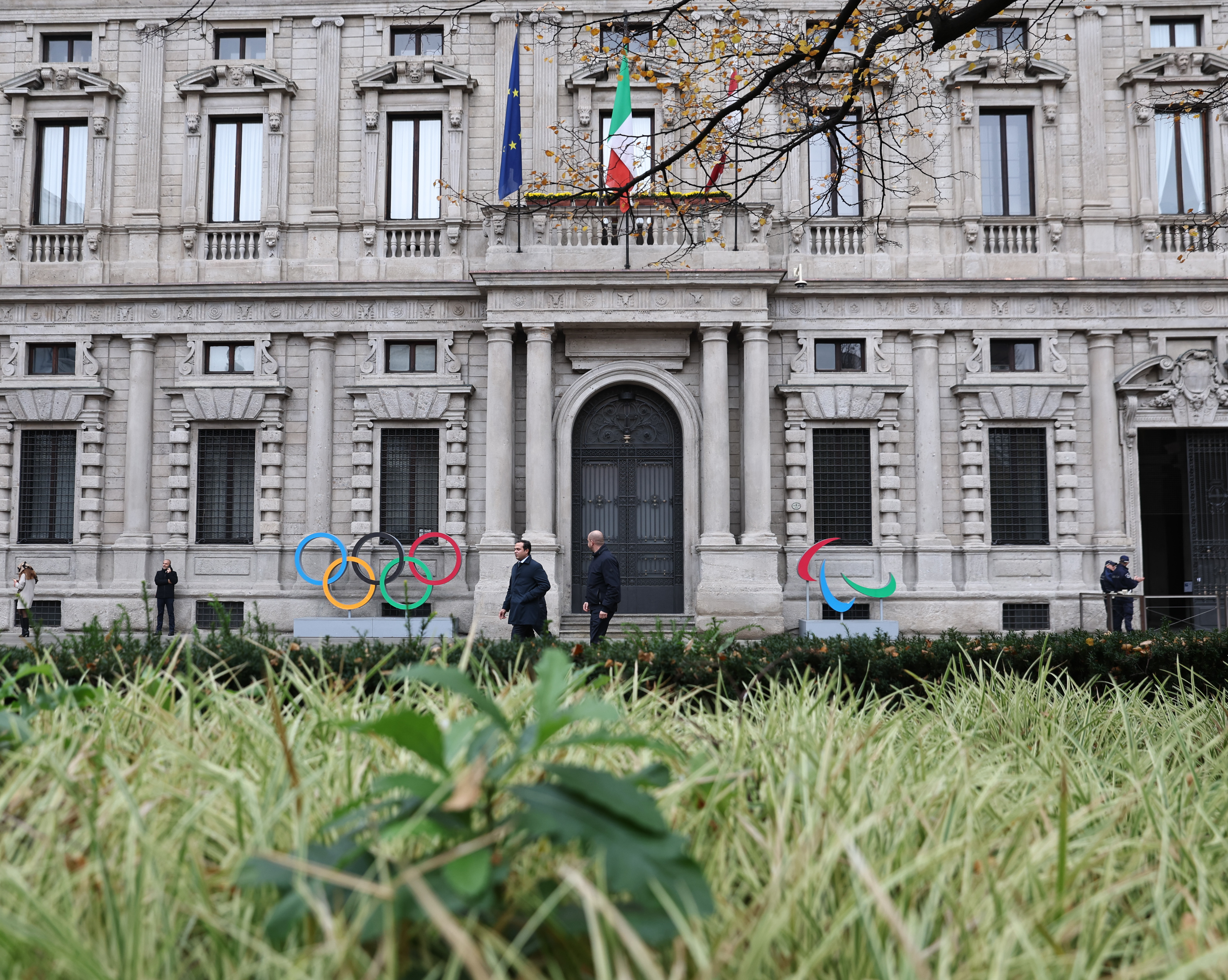 ↑ 2025年在意大利米兰,人们经过米兰市政厅前的奥运会、残奥会会徽。