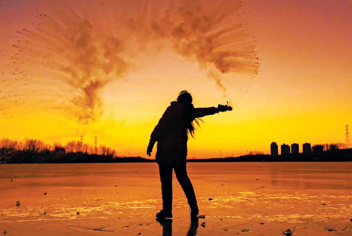 潮白河畔的清晨,市民乐享泼水成冰的浪漫。 张淑贵 摄