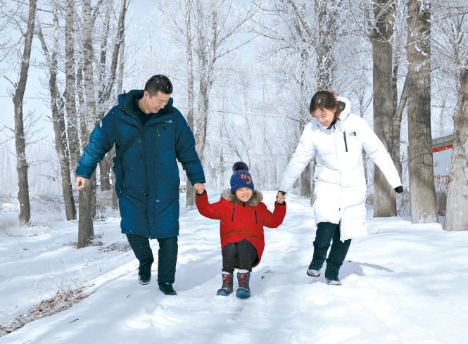 一场大雪后,一家三口牵手漫步在雪地林间。 魏骅 摄
