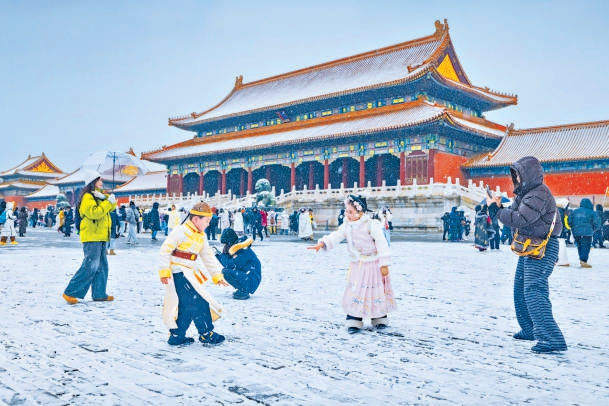 雪中故宫,孩子玩雪嬉戏,大人拍照赏景,欢声笑语为冬日的皇家院落勾勒出独属的浪漫。 吴宏亮 摄