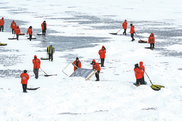 1月19日,颐和园景区为尽快恢复冰场营业,组织工作人员全力清理积雪,让游客能尽早感受到冰面上的畅滑之乐。 关锦峰 摄