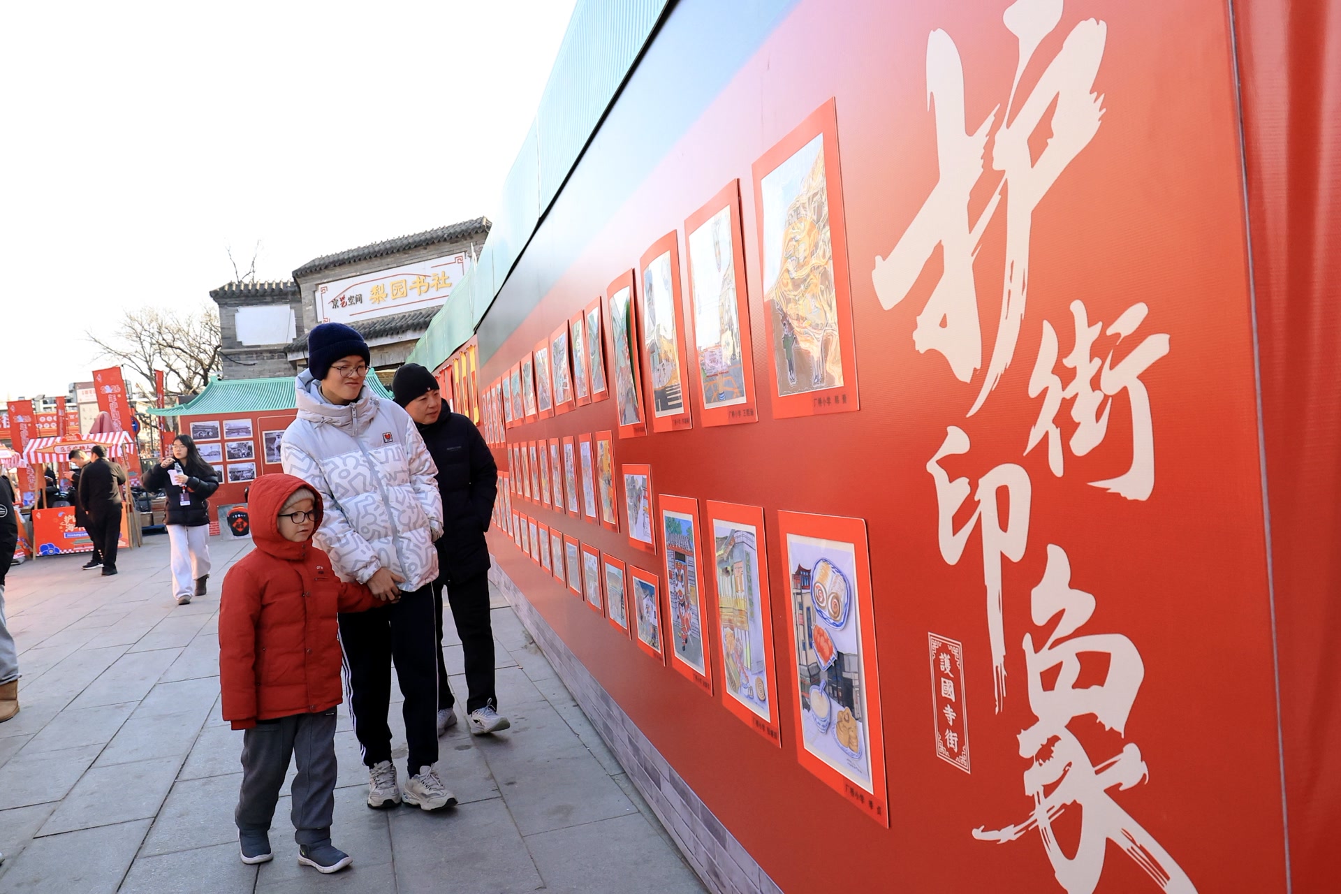与热闹相对应的是一条“海畔拾光长廊”。磨剪子戗菜刀的、捏面人吹糖人的,在“护街印象”书画墙上,前铁社区书画社的居民们以细腻笔画勾勒出胡同风貌、市井百态。从令人垂涎的糖葫芦、护国寺小吃,到恢宏大气的人民剧场、戏韵横生的梅兰芳故居,在“我心中的护国寺街”展区,厂桥小学及前铁、护国寺社区等周边地区的孩子们以童趣之笔绘就出最深的记忆符号。