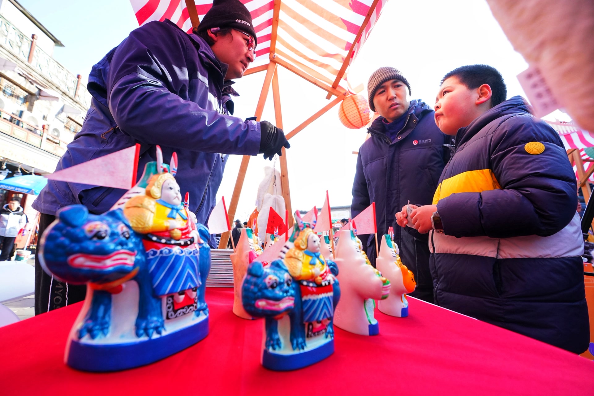 党群服务中心内,亲子默契互动捏面人、画兔儿爷。打卡活动则带领大家走进护国寺小吃店、金刚殿、人民剧场、惠丰门丁肉饼店、梅兰芳故居地标点位,深度感知历史底蕴。完成打卡更有好礼相送,原创的金刚殿飞檐冰箱贴、京剧脸谱钥匙链、“护街小马”玩偶,让参与者将“国粹好韵”和“新年好运”一起打包带回家。