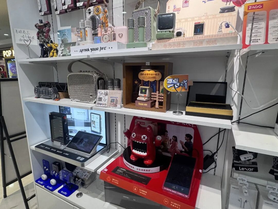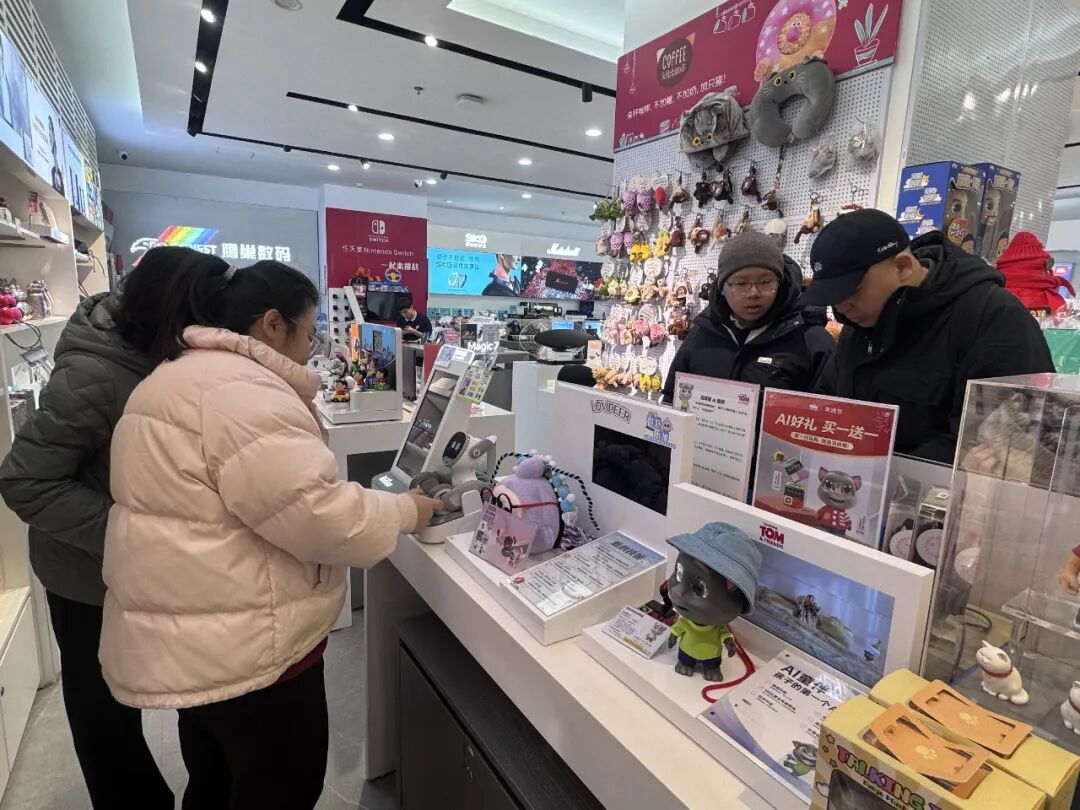 工作日中午,中关村领展购物中心三层的鹰巢数码体验店内人流不断。与传统玩具柜台不同,这里更像一处微型科技展区——陈列着造型各异的AI玩偶、智能耳机等产品,吸引不少年轻消费者驻足体验。