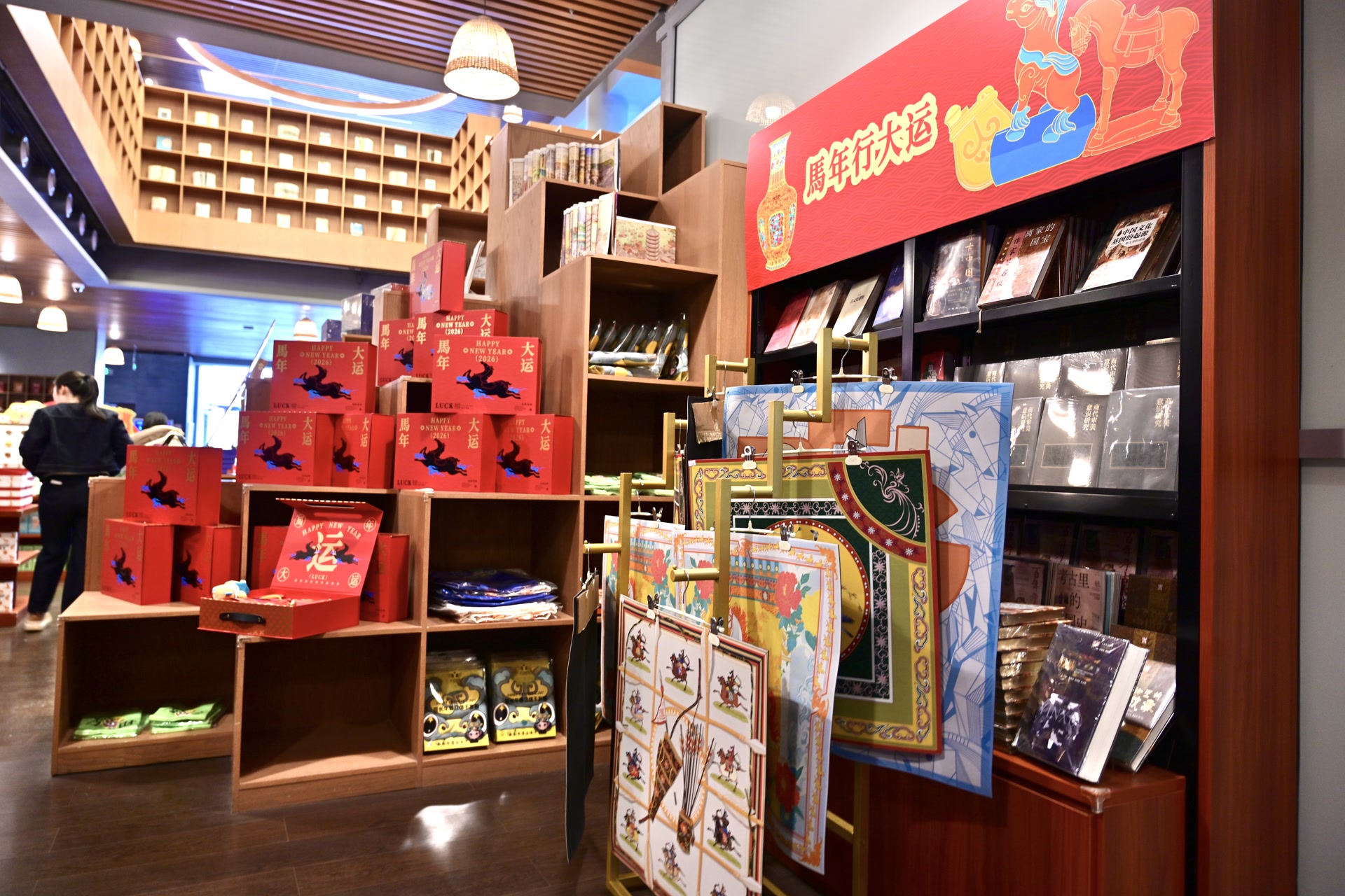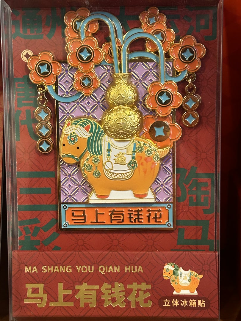 这批文创聚焦生活场景,包括丝巾、地垫、首饰等,将馆藏文物的文化内涵与新春祝福融合,让文物融入日常。运河书屋文创空间负责人孙鹏飞介绍,目前最受欢迎的是“马上有钱花”立体插花冰箱贴。其取材馆藏文物唐代三彩陶马,将文物稳健的形象“转译”成豆豆眼、小圆腿等可爱姿态。马背上的葫芦里盛放的数个花枝,还可以当书签。
