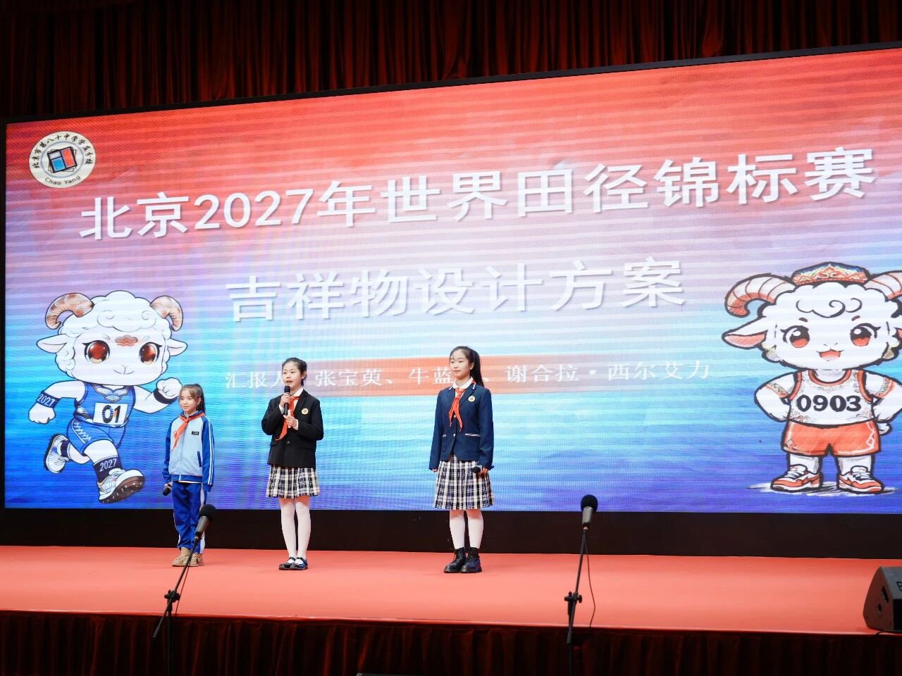 活动现场,五地学生代表联袂带来融合朗诵《京韵逐梦 五地同春》,洋溢着共同参与活动的喜悦与期盼;在“北京2027年世界田径锦标赛会徽、吉祥物及主题口号征集进校园”成果展示环节,北京与新疆结对学生携手呈现创意作品,用画笔诠释对世界级赛事的憧憬,北京2027年田径世锦赛组委会相关负责人为学生代表颁发荣誉证书,鼓励青少年积极参与创作,传递中国声音。